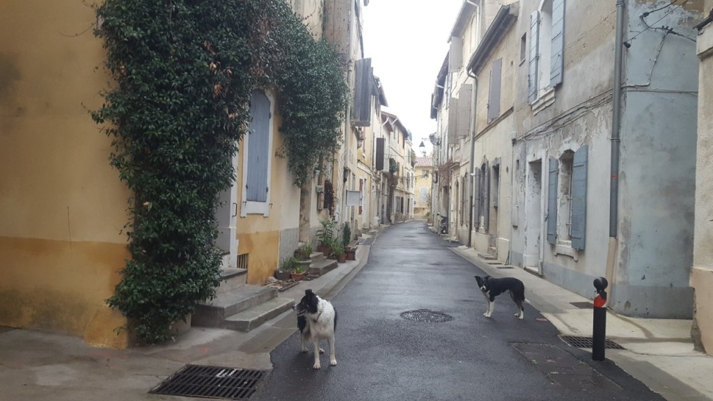 With Barry incapacitated, the dogs and I had much time to explore on our own, walking down the narrow stone flagged streets, Rue de Refuge turning into the old town. Rue des Arnes. Coming across the facade of Church of St Trophime. I gather that the sculptures over the church’s portal, particularly the Last Judgement are considered some of the finest examples of Romanesque sculpture – Rupert surely knows this place.All men of course, men and saints, mostly being eaten or awaiting heaven.