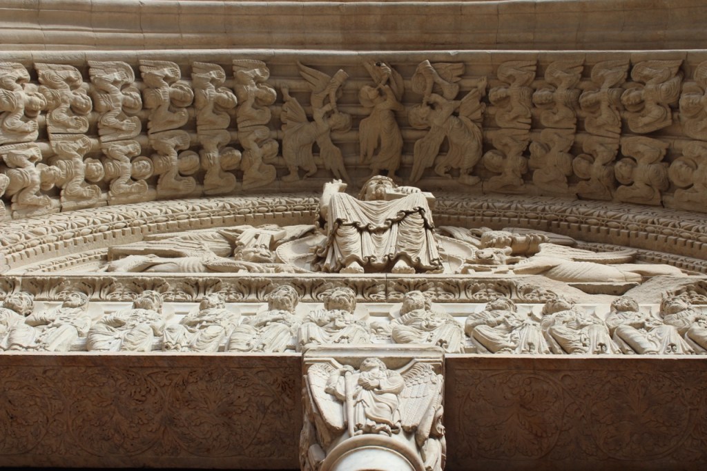 The paraphernalia on the church. All men: men as saints, men being eaten, men awaiting heaven. Where are the women?