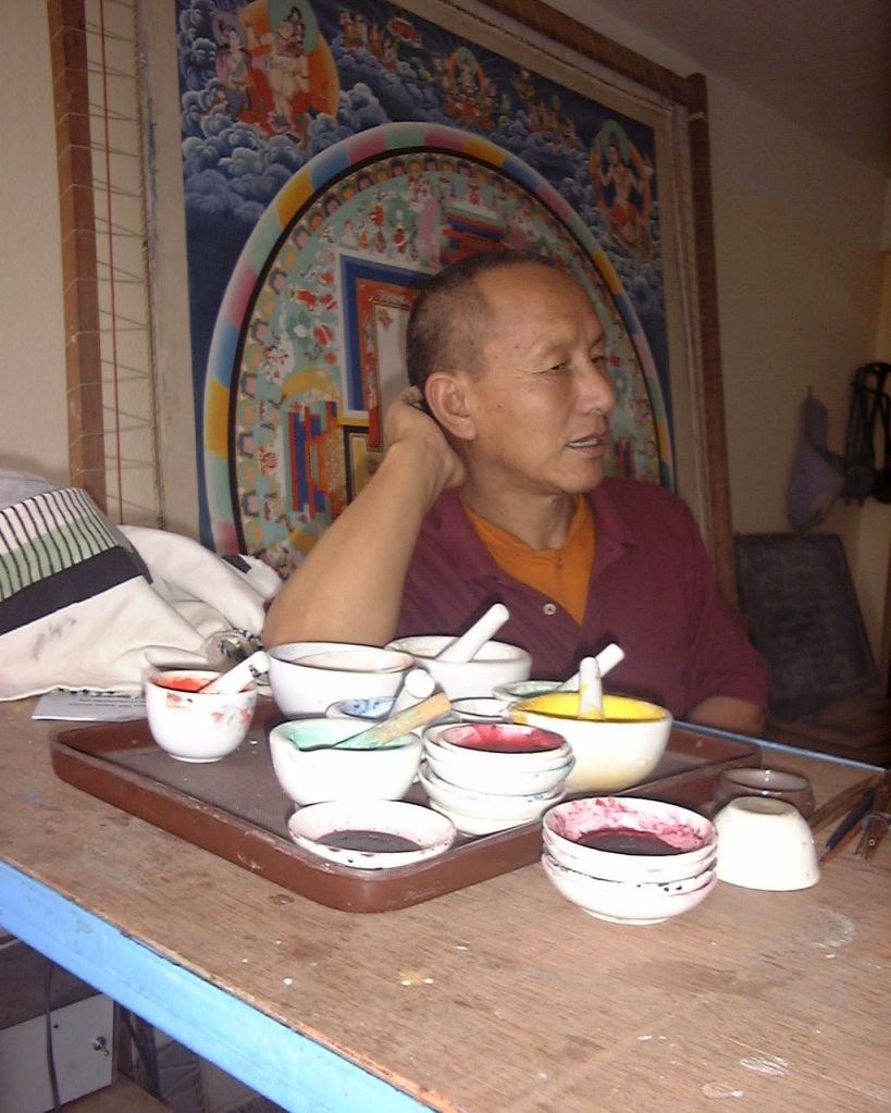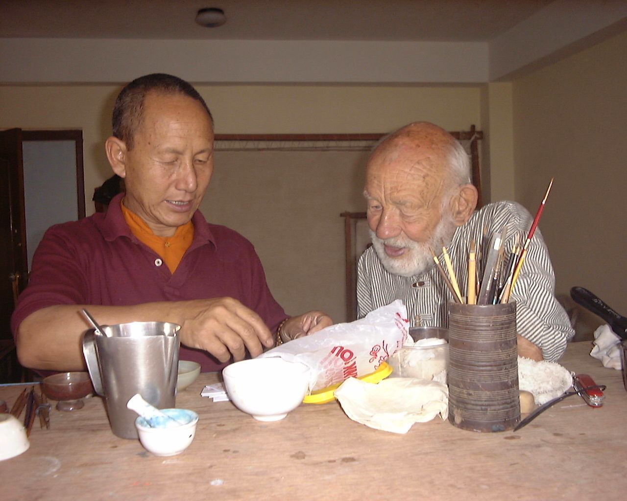 It was our last evening in Kathmandu. Sashi, Sugata and I sat in the restaurant, as Sashi began to tell us about Chhairo. He was a Thanka artist like his father…Sugata turned to Sashi and said: ‘When I came up to Tukuche I visited a Thanka artist. He had two houses: one he lived in and one he used only to paint in, which was little way from his family house to give him isolation and concentration. I took a photograph of him and another of him with his little son, who was just beginning to lean the art of thanka painting. In the courtyard was a dog and a hen, and I asked if the eggs from the hen provided the yolk for the tempera. ‘Yes’ said the Lama.’ Sashi’s face became more and more incredulous. He lifted his hands in the air, and finally bust in laughter.