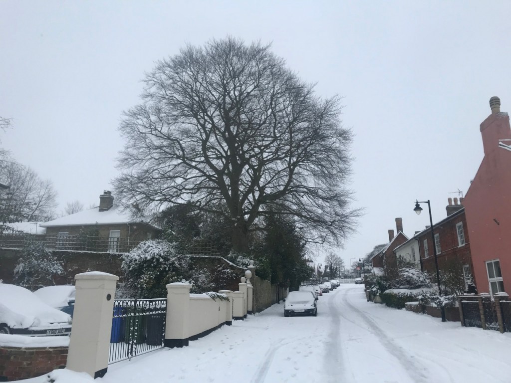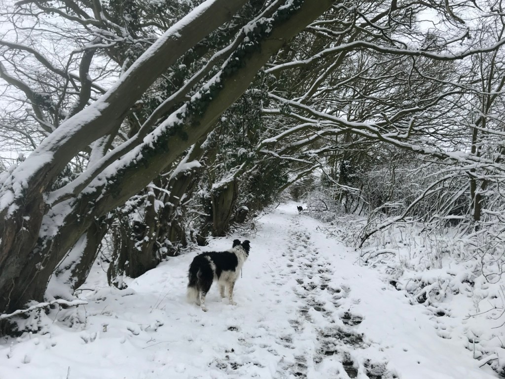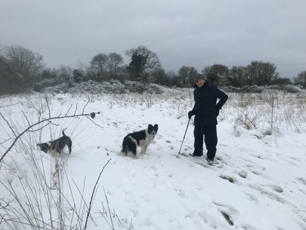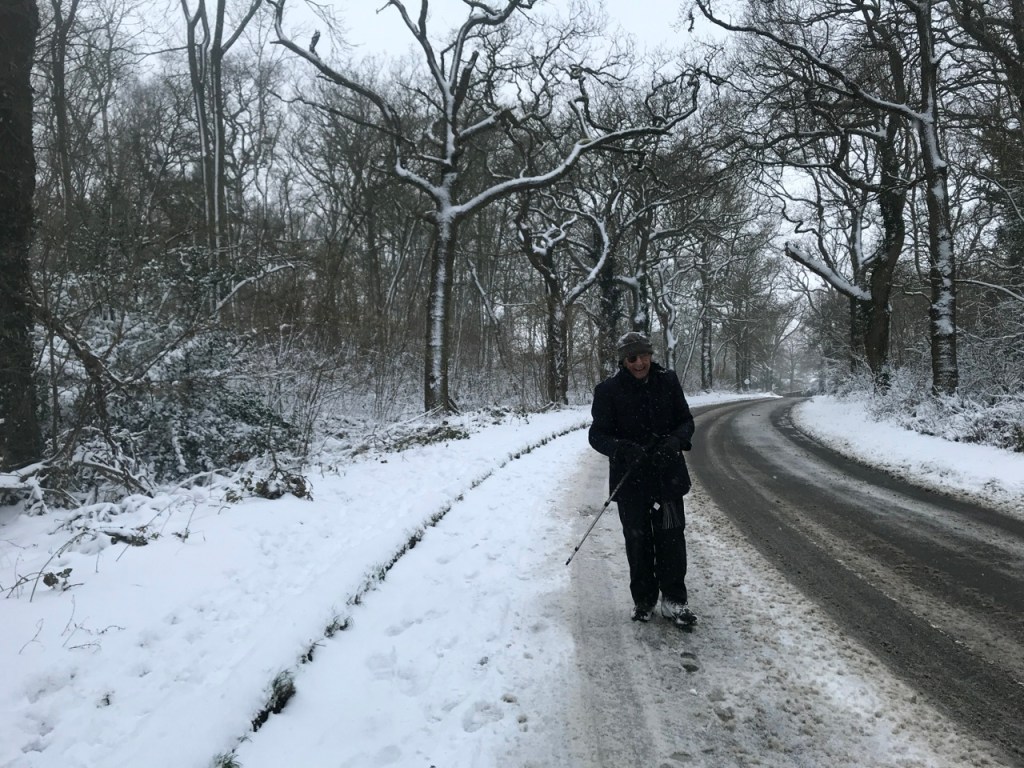 8K After the Beast from the East arrived, here we are in over a foot of snow in places, carving our own footprints (good for leg muscles) we walked from Halesworth, over the railway line, up Loam Pit lane, down my favourite snicket (as we say in Norfolk) edged with old hornbeam coppice, across some fields, through a council estate, beside Holton round tower church, to my wood in Holton, finally to deliver a package to East Lodge. Back along the roads, via a conversation with Ros (socially distanced). We talked of frost bitten fingers, wondered about the freezing temperature of blood. I heard the story of how John bought his first flat in London with the money from selling a Ford Cortina (?), and their first dog, what was he called? Amazing how short the memory becomes. We had the land to ourselves, the road empty but for the occassional Land Rover, all inhabitants of homes inside, snow high on their stationary cars.