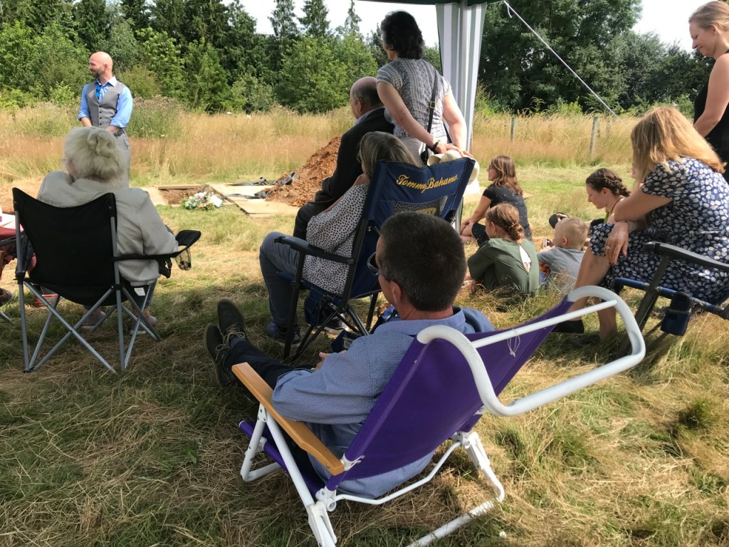 We gathered. Around the hole in the ground, the coffin of woven whicker already in place. Ushi’s friends and family. Dom led the ceremony, starting with wry amusement, ‘It is my first time, it is just me, no MC, and I may become tearful’. Indeed he did. This is the emotional part, he declared. He spoke of his mother, her healing and nurture. His bike accident after he’d lost his foot and had it sown on again. Her robust massaging. He read a story from a woman whose life she had in effect saved through her treatment. Berenice, who was sitting on the grass beside, stood and spoke next, with a brief story of Ushi’s early life in Germany, of her three brothers, all older only one now surviving. Of how she was on a verandah until she could walk off it. Of the family holidays together (I remember Goa), of Ushi’s care of Berenice’s two daughters. My turn came next, followed by a woman who was once her neighbour, to whom she bought meals on wheels.