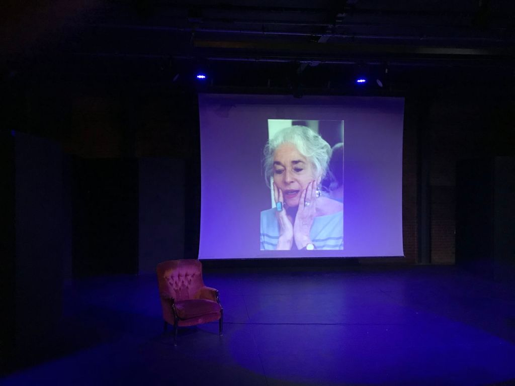 Dean read some rather odd and conventional poems, the best of which was Gus the Theatre Cat. While on the stage a relatively recent photo of her, with the chair – probably supplied by Anne Grey – where she used to sit on the final visits to the Cut, right a the back.