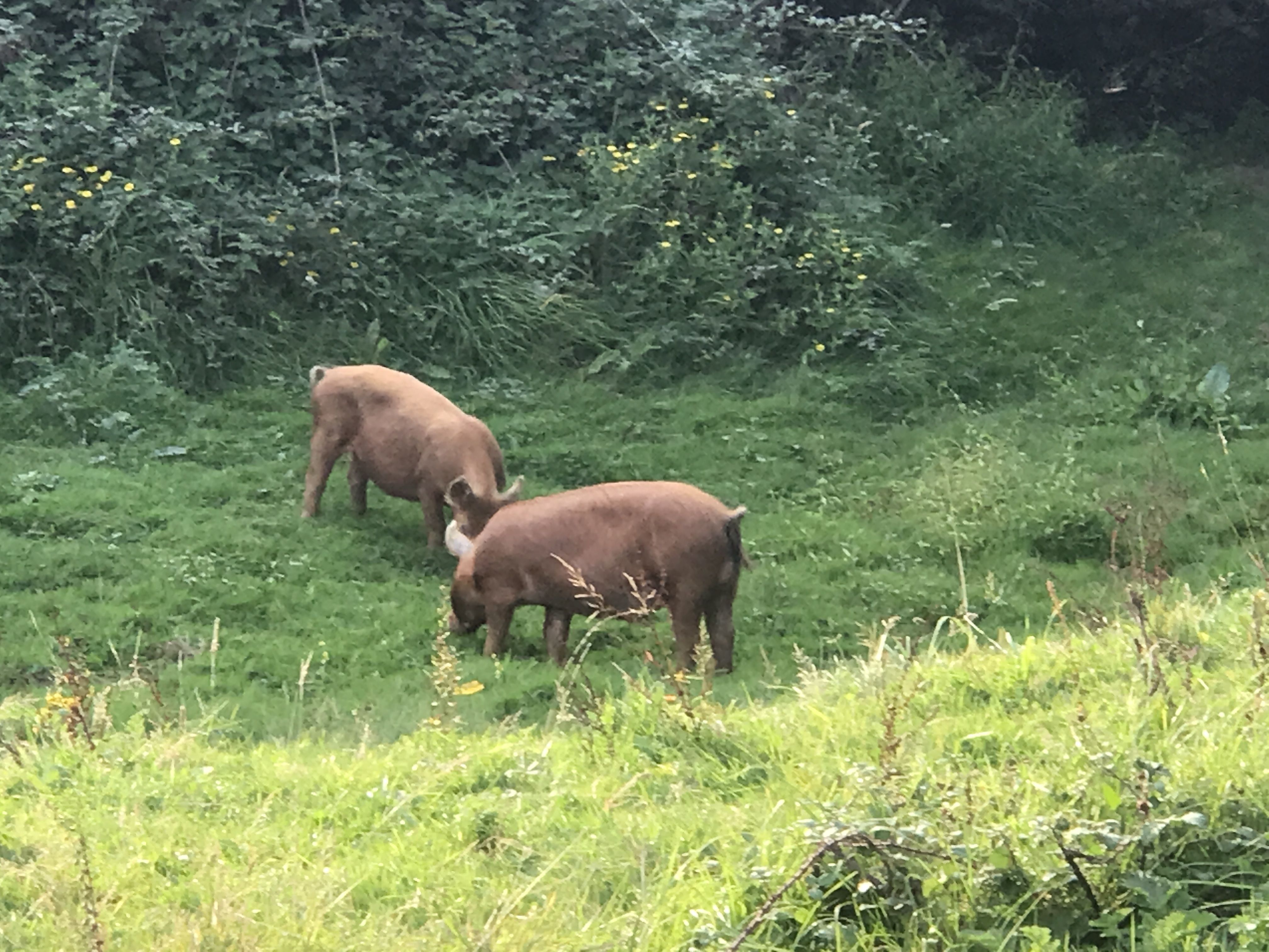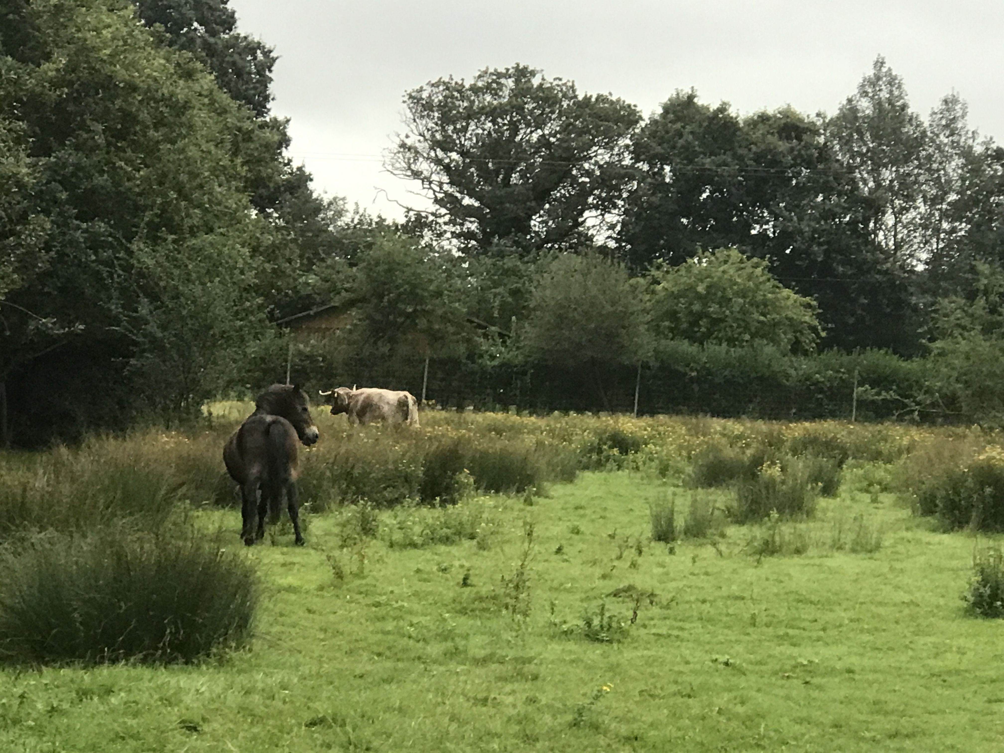 We walked out. Yellow route. We didn’t realise then but the tight yellow route explores the southern part of the 3,000 acres of Knepp, the part most wild. Indeed we saw all major beasts that first walk: a herd of fallow deer, the long horn cattle, a couple of Tamworth pigs, and the Exmore ponies. The land, enabled by these natural balancers, amazed me. The hedgerows were a celebration of blackthorn these days full of sloe berries, as well as briar, with an occasional maple, that all merged into the field, full of bosoms of bramble. Walking along field edges, from thickets ponies emerged, and the long horn pushed passed, breaking branches in their wake. This was how the land was.