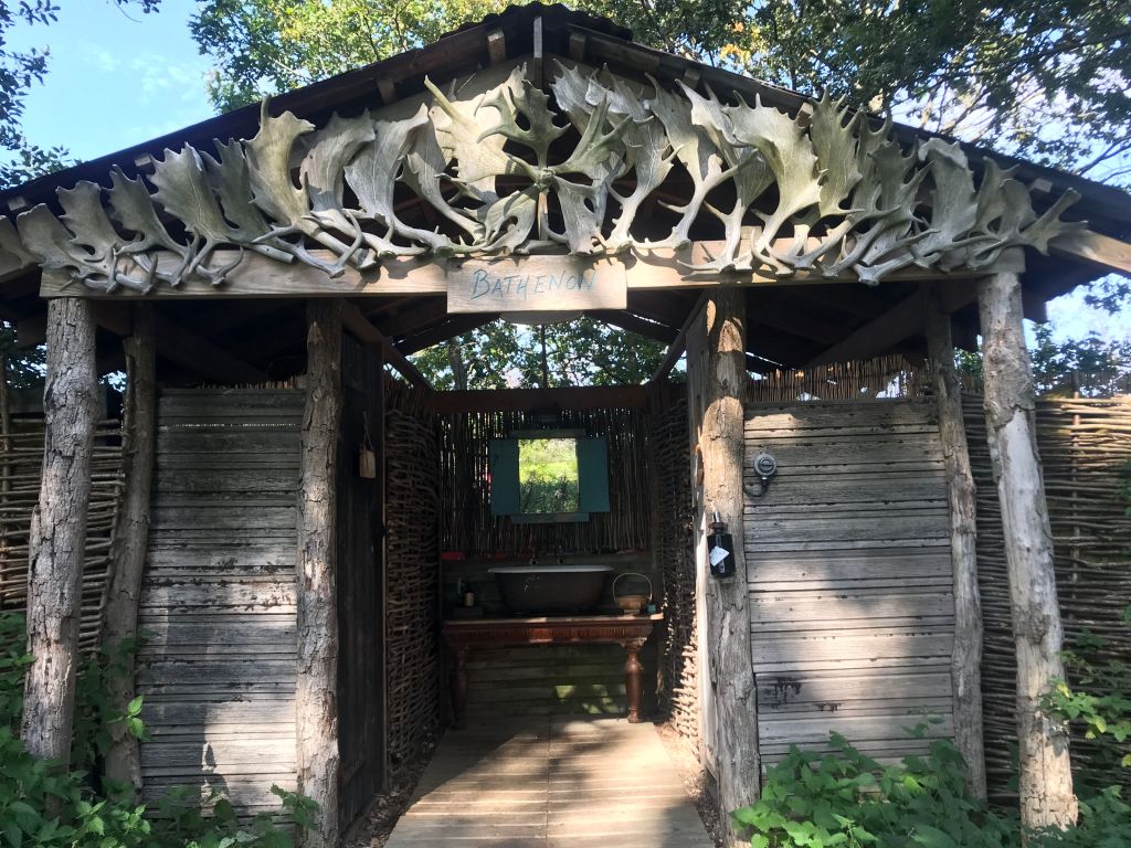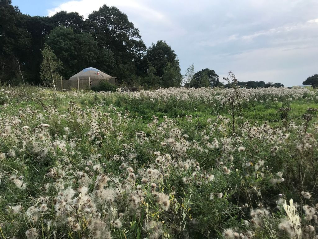 We are glamping in a yurt – the first time for both of us – the Turtle Dove, chosen as it’s was the Turtle Dove that was the litmus paper for the success of Knepp – their arrival and staying two years in to the re-wilding. It is spacious and light, the bed more than comfortable, the sheets luxurious (Heals I noticed), and we never spent enough time in it to really appreciate it’s detail, latticework of wood, circle of light at the top. It was far too hot on that first night, the bucket of wood ordered would not be needed for a fire, we repaired immediately to the field kitchen.