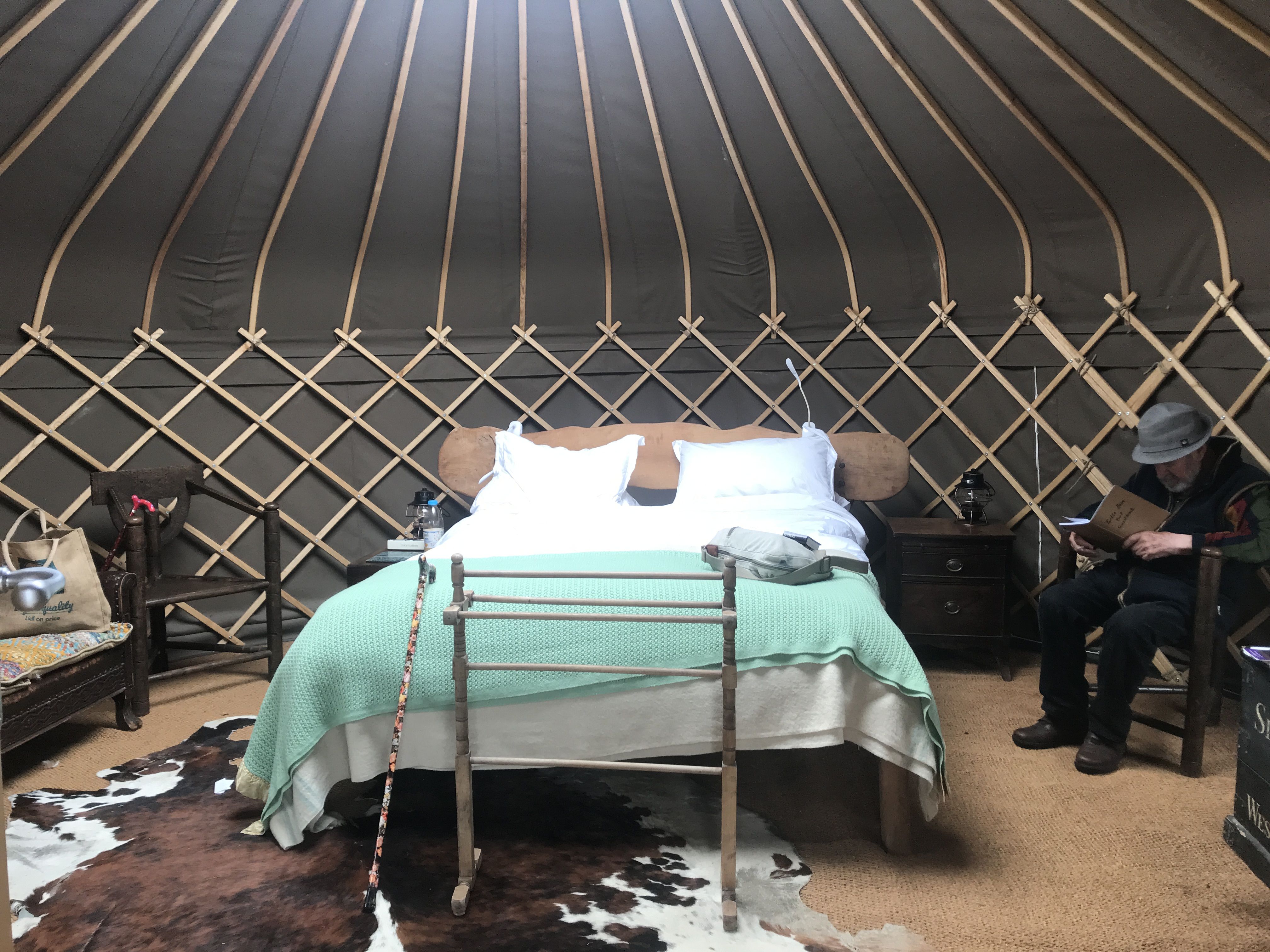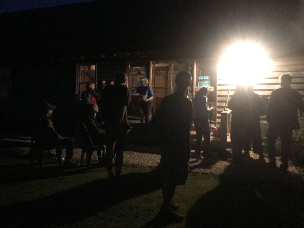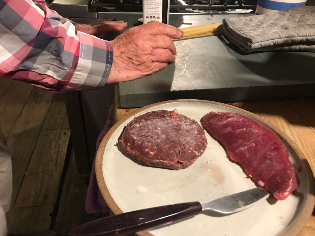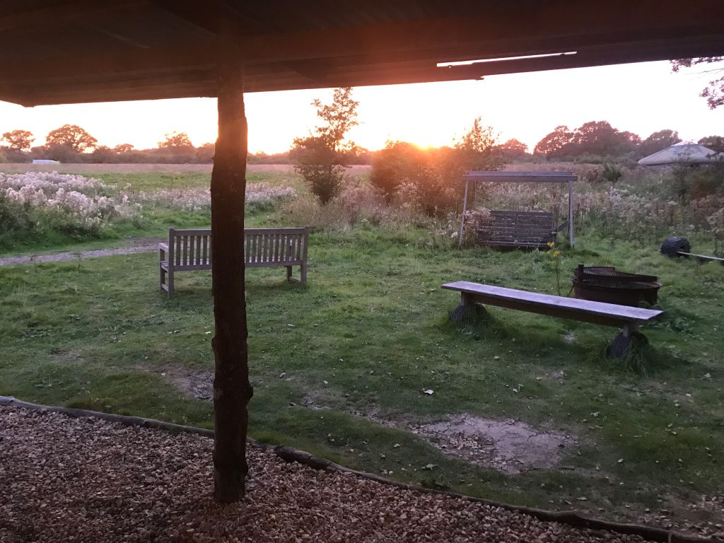 We are in a field, with shepherds huts, 2-3 other yurts, and further down a field of tents. There is plenty of space, like on Holkham beach. Communal to us all is the kitchen, and here we gathered to cook, and naturally exchange. ‘Like Youth Hostel days’ one said. We’d purchased some venison burgers and a steak from the go down, to sample the meat of the land. Michael and I cooked together, I nervous of over cooking, Michael nervous of frozen inside meat. It was dry, a bit chewy but very tasty, nicely complemented with the red merlot. A family of mother father and daughter engage us in conversation, also their first time here.