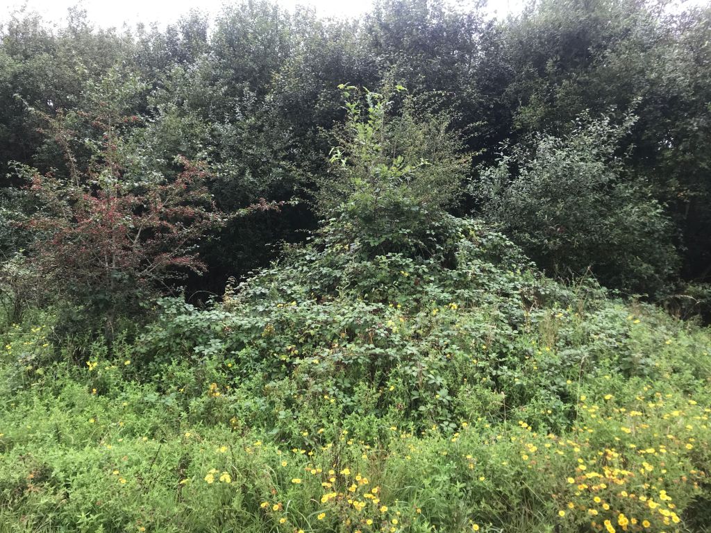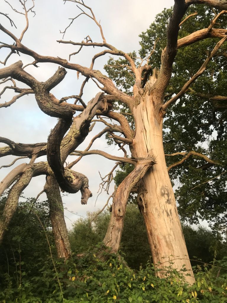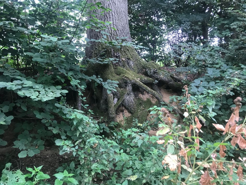 On the way back I saw it with my own eyes: A bosom of bramble out of which grew a sapling oak, protected and healthy. Kept seeing roots of trees – down Greens Lane – and ways through hedgrows create by animals moving freely.