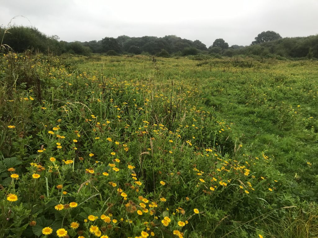 The fields are yellow, with common fleabane, the Ragwort was just going to seed. Beside rippening red and black berries of briar and blackberry.