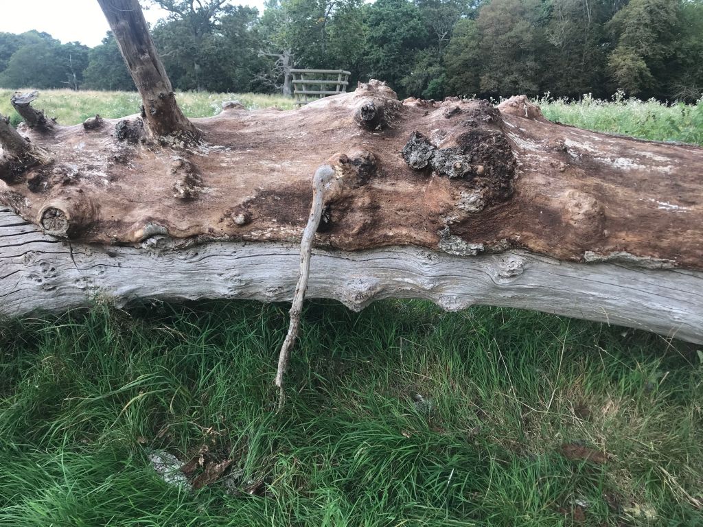 I lost the red route sign right at the start and landed in a field of long horns, some suckling their offspring, and after feeling their lack of interest in me, had to shin over a fence to land in Sallow Lane. Here I rejoined the route, arriving at Knepp ruin, a fine tower standing on high ground beside the marsh river, now meandering. A dozen or so ponies were enjoying the rich grass beside the stream. Under a dead branch of an oak, nicely left, to the ‘estate Parkland’ of the park, and in the distance, Knepp castle, the present family seat of the Burrells. Oaks with brackets seeping the juice they had funneled from the cambium of the tree. Passed the Mill house, and a large damn of water, where a Grebe dallied with a couple of swans.