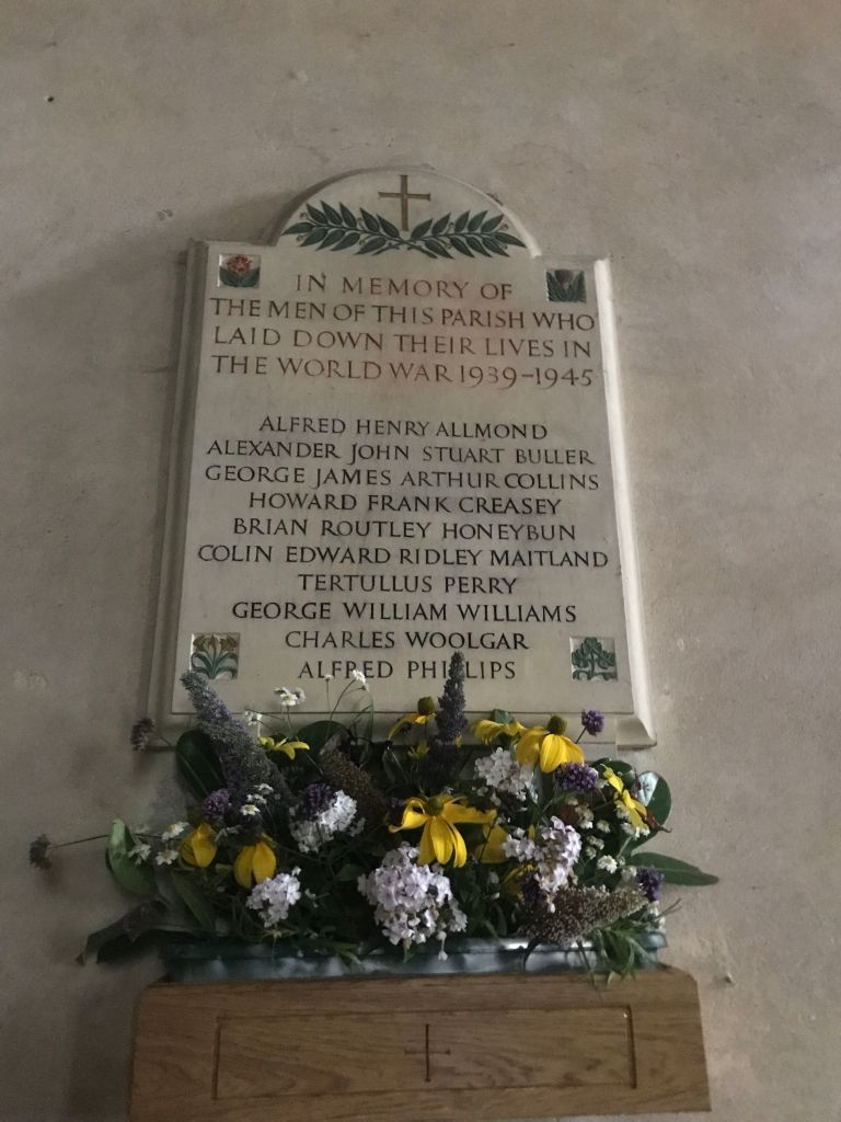 Fascinating windows, turn of the century: One by CE Kempe 1893 in memory of the Burrell family and one by by T W Camm and dating from 1922 depicting the Annunciation and includes the Shipley windmill at the base. Unsual names of those fallen in the war of Terculius Perry, Brian Honey Bird.