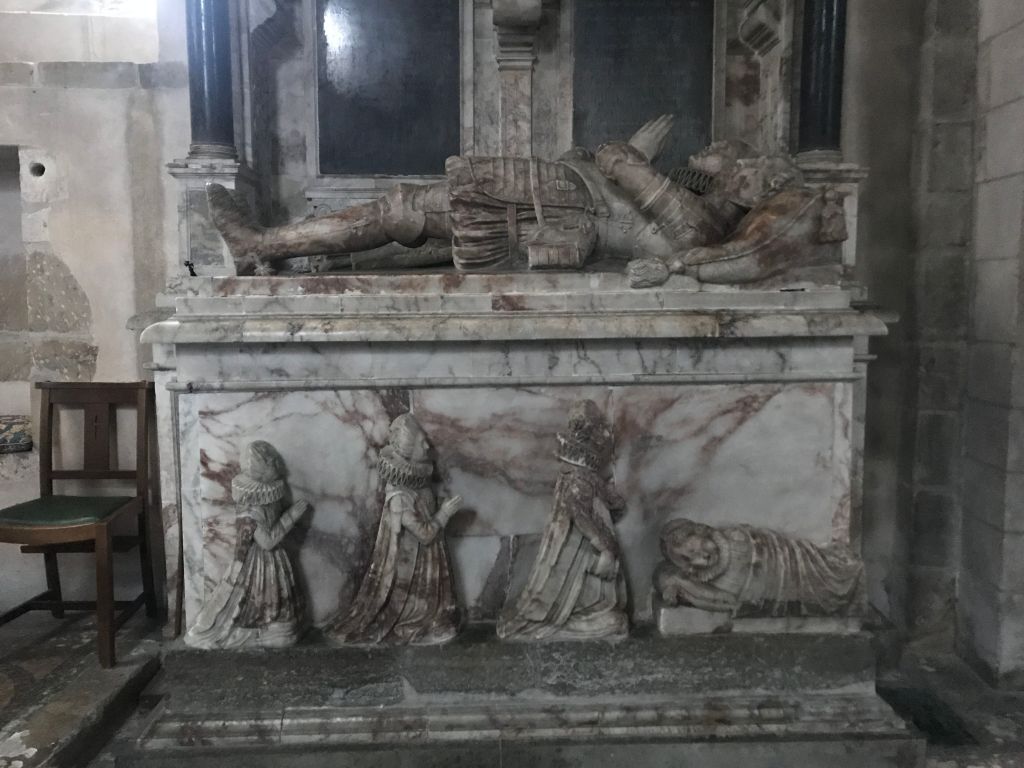 The church, completed soon after 1150, with squat square tower and attractive graveyard attracted, and indeed inside the tombs of former Sir Charles Burrell. Slate tablet to John Ireland (d1962), the composer. Alabaster effigies of Sir Thomas Caryll (d1616) and his wife with their children kneel or lie on the tomb-chest.