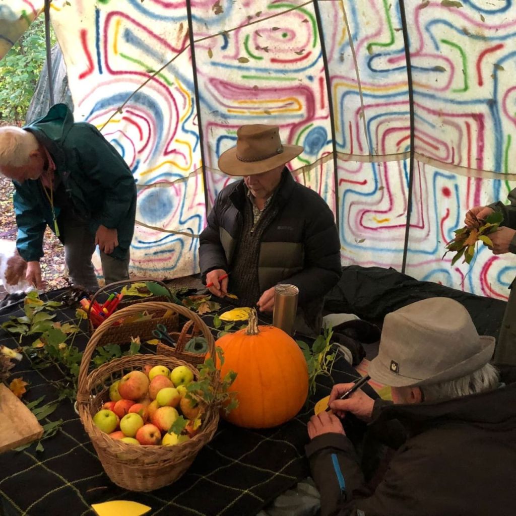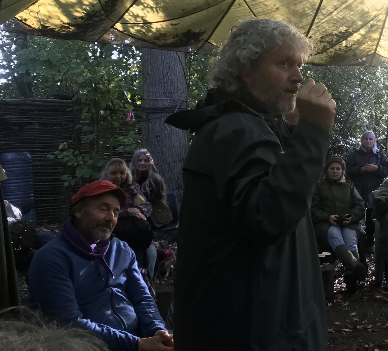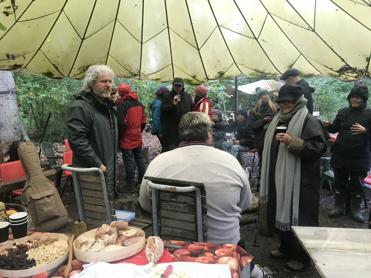 Weather was not in our favour. The wind blew, the sail came loose, and led by a determined Mell the team arrived early to tie it down. We could not allow people in until the wind died down. Internet and Met office said 2pm and they were spot on. It gave us time to have Philip and Stephanie to ourselves, and Kevin wisely asked Philip to lead us in a gathering to find our own ancestors, to ground ourselves, before the brave arrived. He reminded us that we are like trees, apparently stand alone but all connected through the underground magic of mycelium – the network of fungal threads or hyphae – that link and feed and correspond.