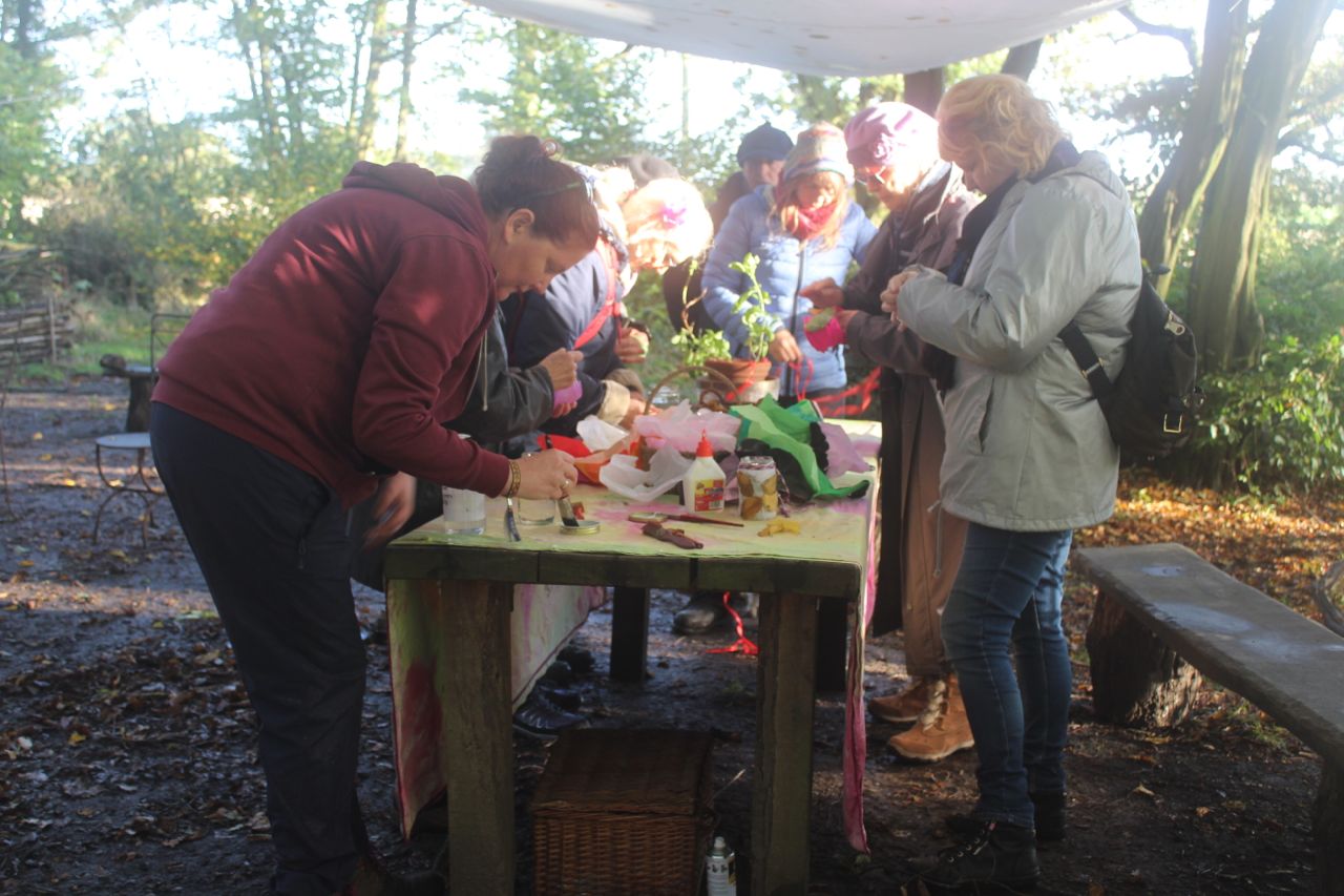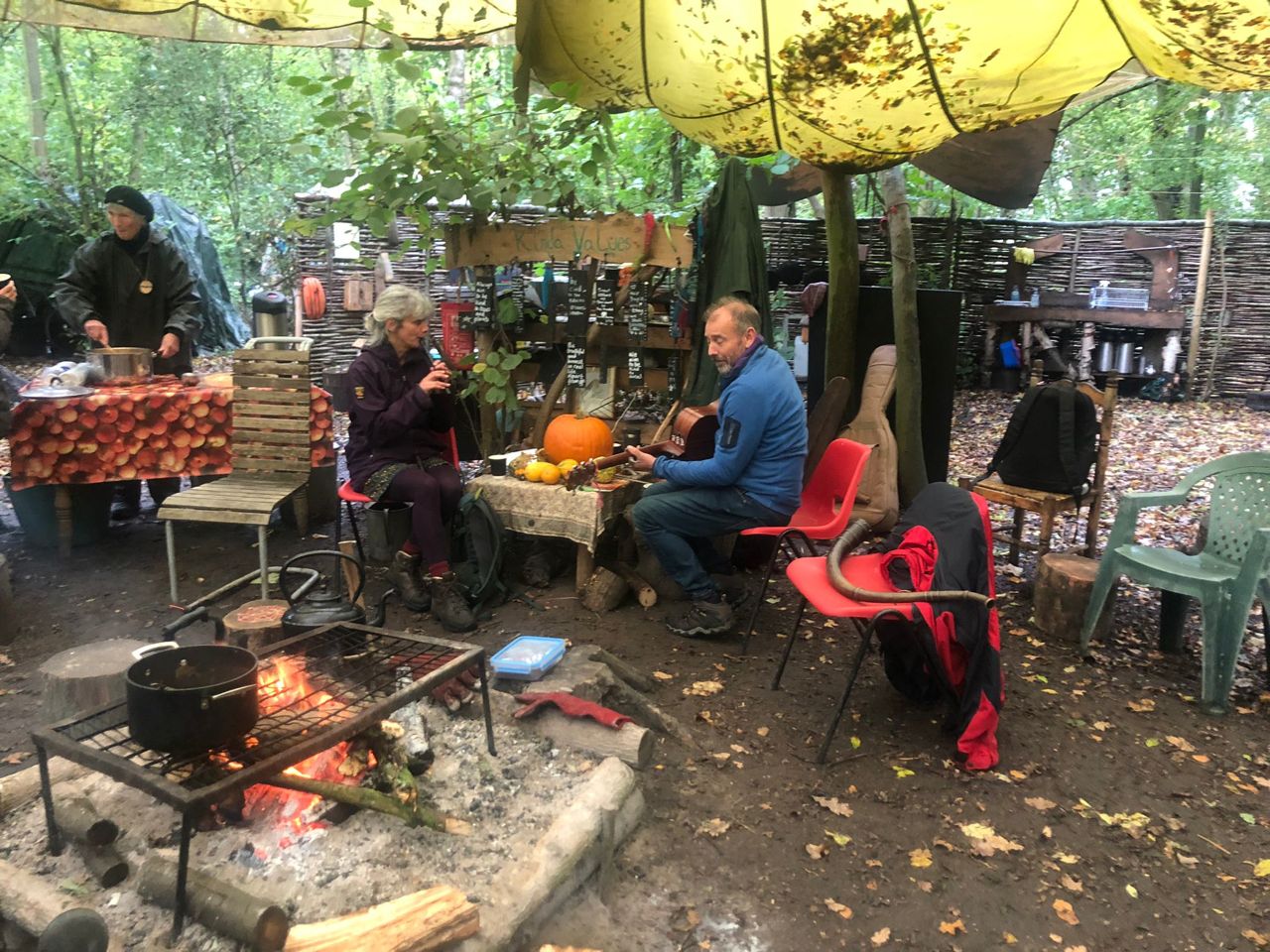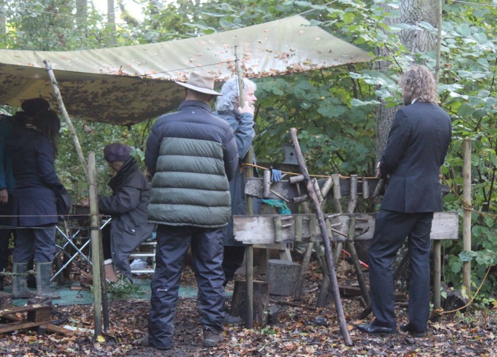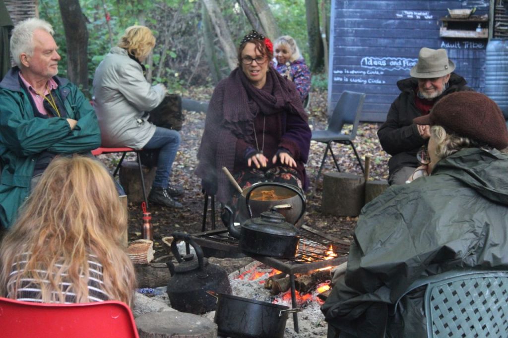 Weather was not in our favour. The wind blew, the sail came loose, and led by a determined Mell the team arrived early to tie it down. We could not allow people in until the wind died down. Internet and Met office said 2pm and they were spot on. It gave us time to have Philip and Stephanie to ourselves, and Kevin wisely asked Philip to lead us in a gathering to find our own ancestors, to ground ourselves, before the brave arrived. He reminded us that we are like trees, apparently stand alone but all connected through the underground magic of mycelium – the network of fungal threads or hyphae – that link and feed and correspond.