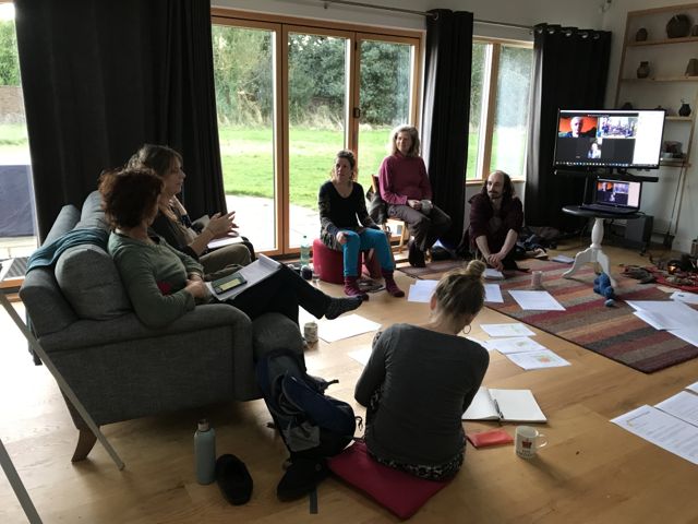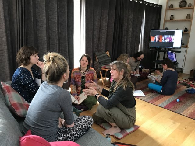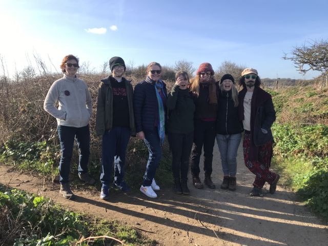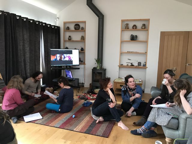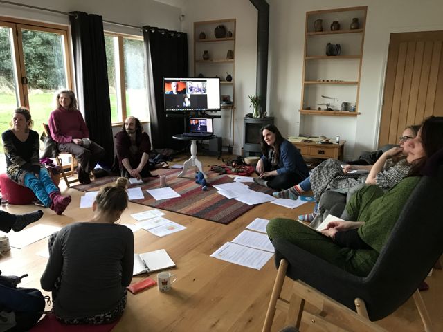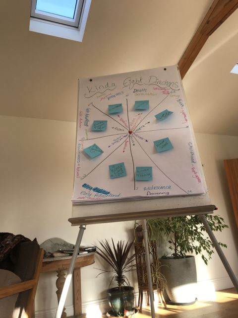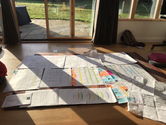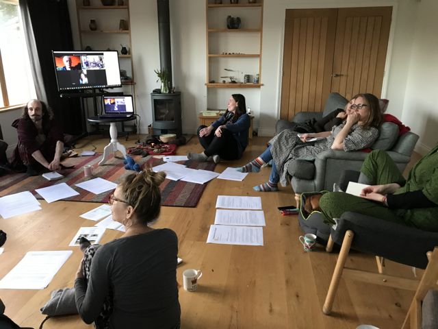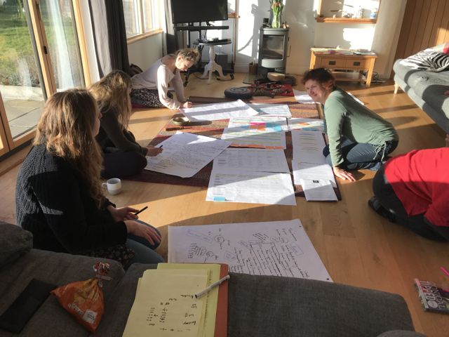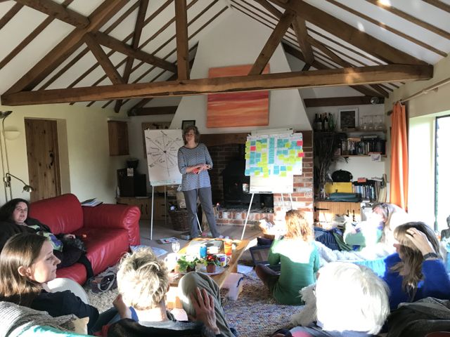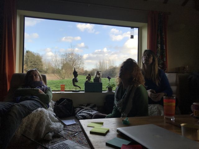 We opened our circle with a check in, or as Mell introduced: ‘Brushing off the dust of the road’. One had had a ‘shit couple of weeks’, one vulnerable, one almost back in one piece, one roller coaster, one had finished a big project, one was potentially starting a big project. But none was so amazing as M: she’d just heard she was 4 weeks with child! With us and the 4 week child were: Mell, vision holder, Kym, on Admin, Eloise who’d left and now returned on land and Bramfield, Alice, Heidi, Meg, Shona, Jo, Theo, and Po our admin astronaut. Kally and Blake both in Covid isolation, joined us on Zoom, Kally most of the day, which cannot have been easy for her. Lesley almost joined us, but couldn’t at the last minute. Christina, with us 2 years ago, returned to facilitate, a perfect outsider insider, to guide us, watch us, and invite.