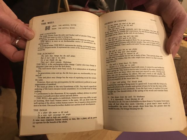All this hard work necessitated a gin, and some skill exchange. Alice invited me to fly, and later she aided Shona to fly. I resurrected my shoulder massage skills on Christina and she read the I Ching – my first experience. Christina invited me to ask a question, a quandary I needed to decide. That was easy, the field. I turned out the 3 five pence pieces 6 times, with various results – all heads, all tails and various mixes. The first hexagrams was 48 The Well, the second was 11 Peace (Contentment). How did Christina describe the I Ching? It does not tell you what to do, but highlights metaphorical scenarios for you to interpret and apply to your question.