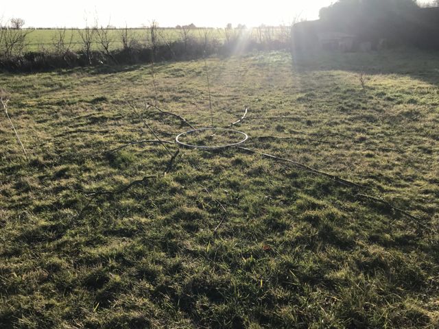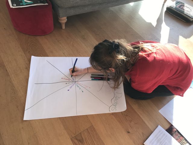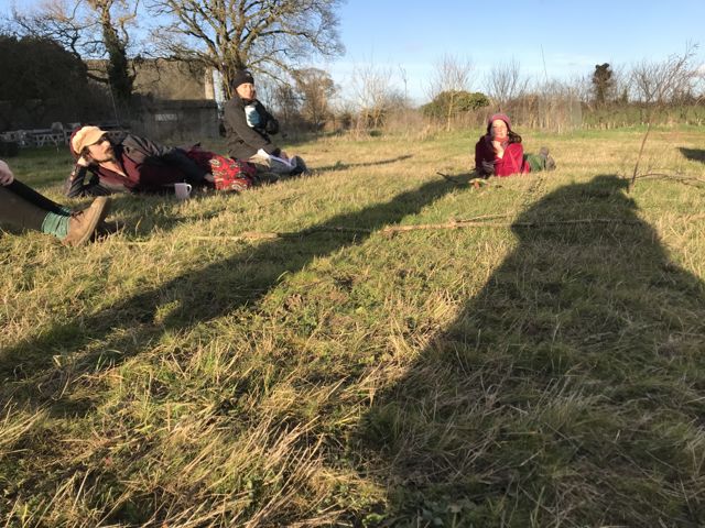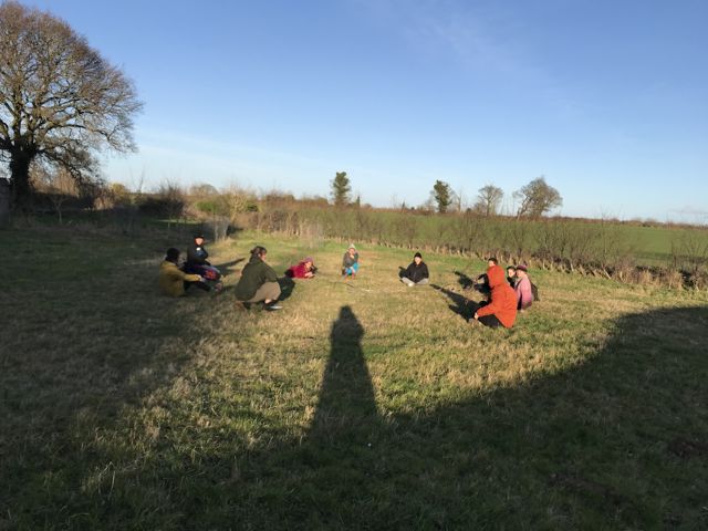 After lunch, after a walk to where the corvids gathered and badgers set, we met in the field and made our 8 spoke wheel, Mell calling directions. We all said what was important to include. Ancestors, said Po, the ancestors who informed us, where we are now. The trees and nature and all that we learn above and below the ground I said. Safety and nonsense, said Theo! …..
