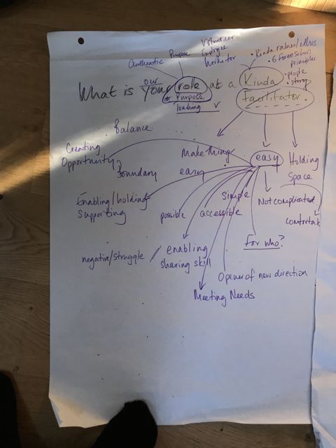 We unpicked the question: What is your role as a Kinda Facilitator? I led, in a semi Socratic way, far too fast, but we picked up immediately a language difference in the undertones of the word ‘enable’ to describe facilitator. To some it had too much of the I in it, and was linked to enabling addictions, to others it described the guiding/helping quality of facilitation. The other word we analysed, finally deciding to divide it into two: Role and Purpose. In small groups we attempted to answer the question of role, some very practically, some more philosophically addressing purpose. We were diving into the vision.