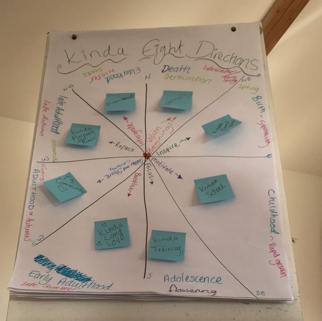Here we began to explore the wider Kinda, the vision of expanding into 8 directions: not only Kinda Forest School, but a democratic school, Kinda land, Kinda Elders, Kinda Training etc.