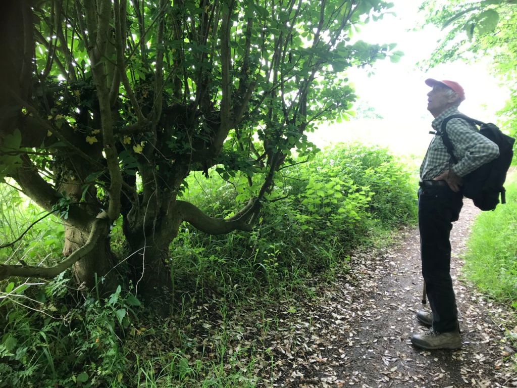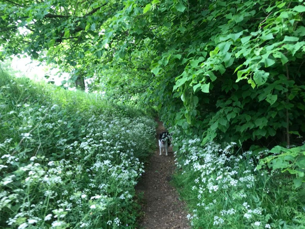 We set off on the circular route mentioned above, starting at Marsh Lane, Earsham. The dead-end lane soon became a single track foot path, ancient in its origins, with old coppice of hazel, maple and even horse chestnut on it’s sides. The ground with the confetti of Map blossom, the sides with cow parsley. Passing Cold Bath House – which the owner said was no longer cold – we began a gentle ascent with views over the Waveney valley. Perfect pastoral. Cows grazing in the distance, the meadow healthy green after the recent rain, peppered with buttercups.