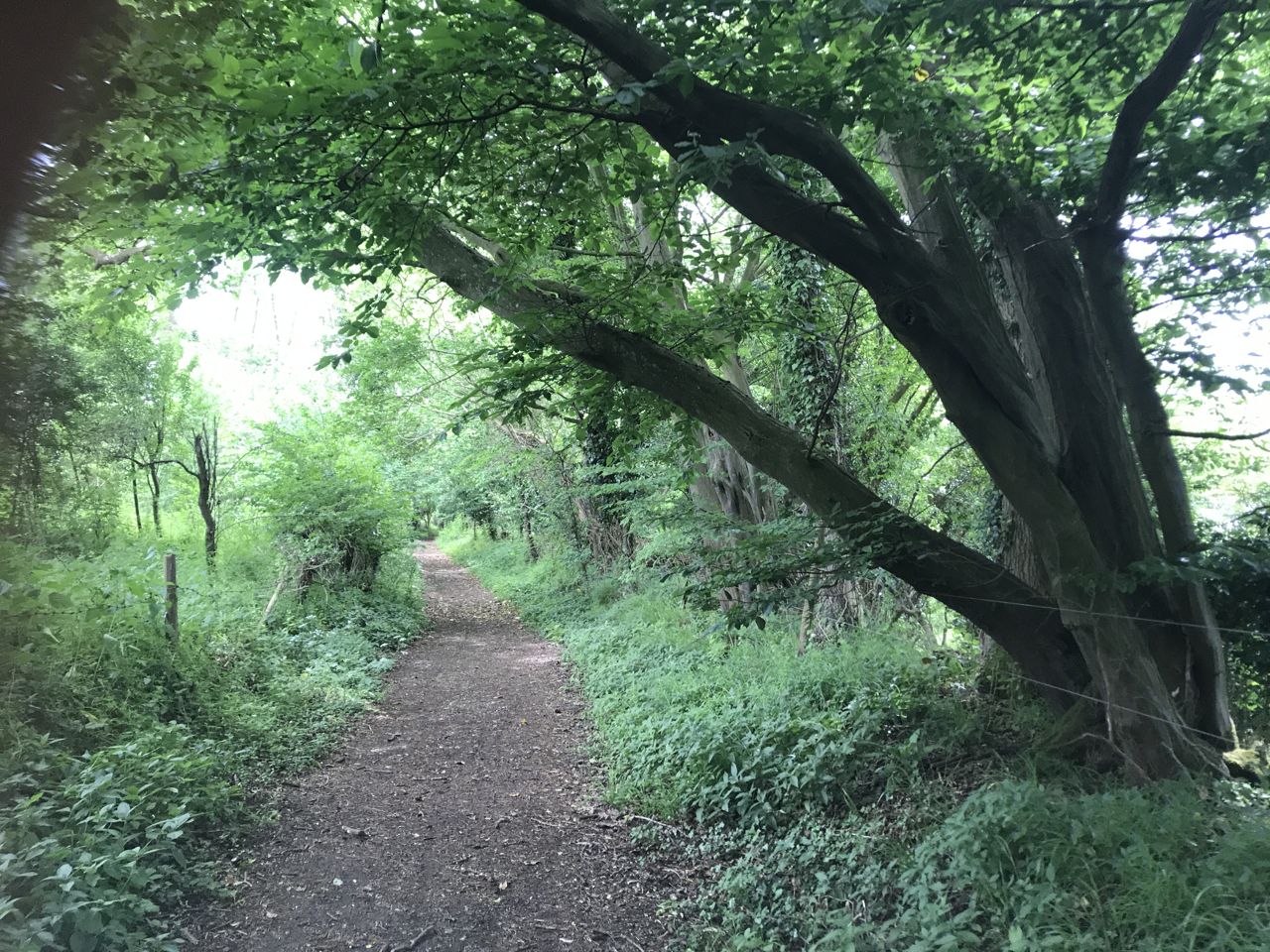 We set off on the circular route mentioned above, starting at Marsh Lane, Earsham. The dead-end lane soon became a single track foot path, ancient in its origins, with old coppice of hazel, maple and even horse chestnut on it’s sides. The ground with the confetti of Map blossom, the sides with cow parsley. Passing Cold Bath House – which the owner said was no longer cold – we began a gentle ascent with views over the Waveney valley. Perfect pastoral. Cows grazing in the distance, the meadow healthy green after the recent rain, peppered with buttercups.