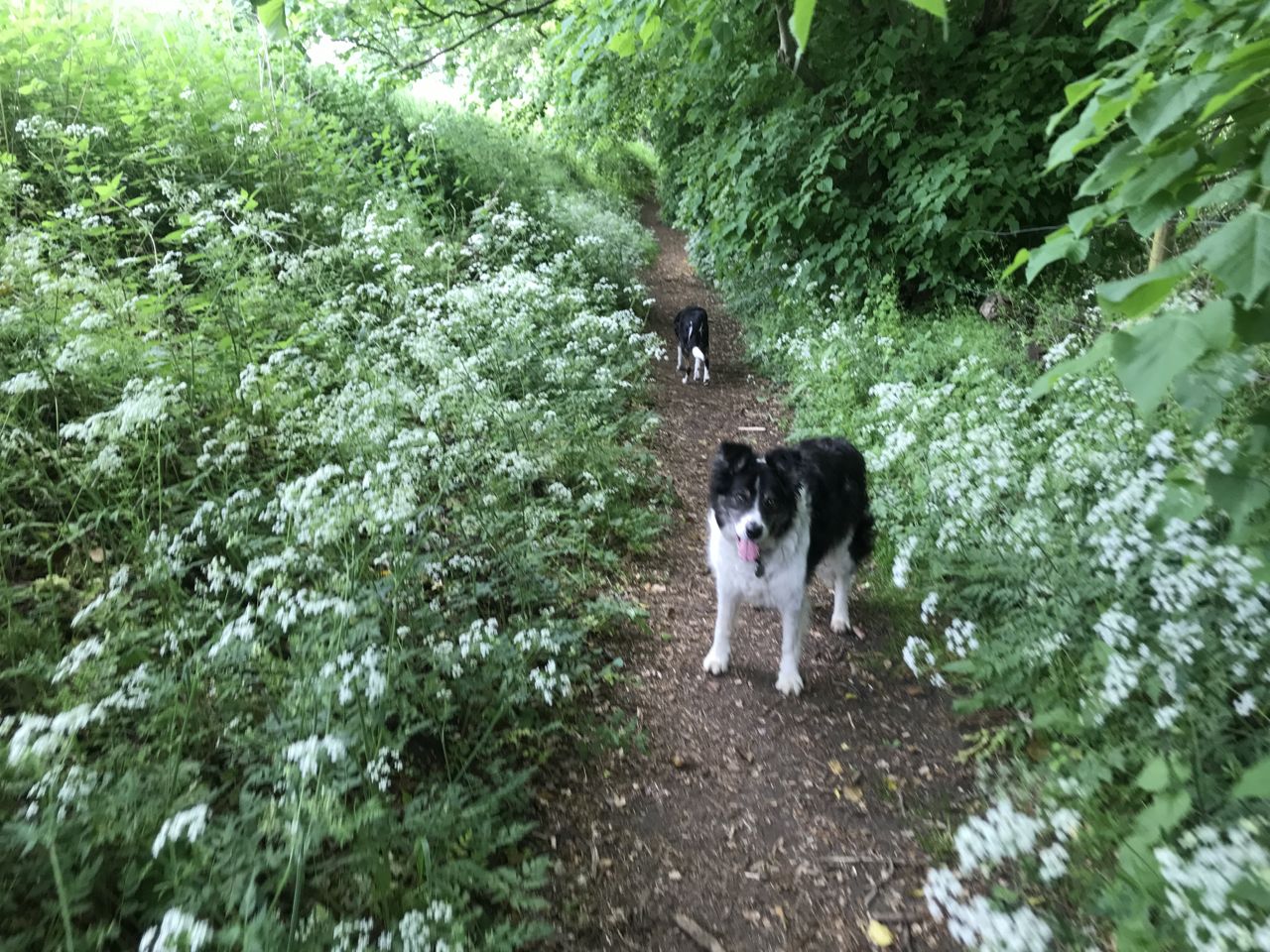 At the end in order to attempt a rendez vous we cut across the meadow, cows ignoring us and the dogs (Bobji carrying 5-6 pups and 6 days to giving birth) and climbed the gentle hill into Bungay. The Buttercross, the rendez-vous point was empty. We needed to descend again, but despite finding a few trailers with placards we failed to find the troupe. Although we did find Michael, who lifted us back to Marsh lane after a coffee.