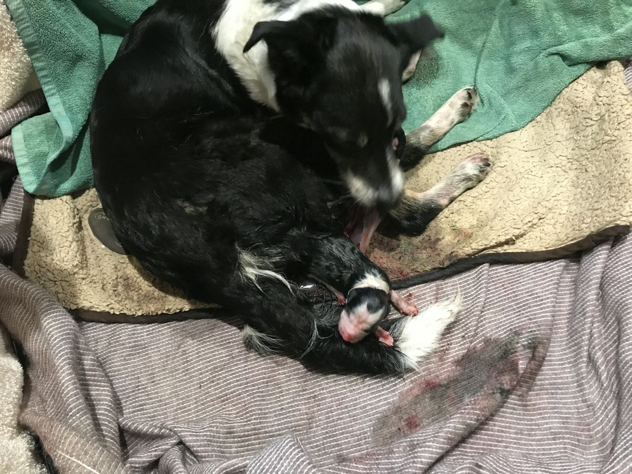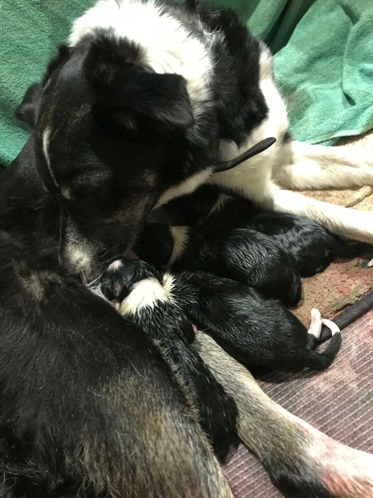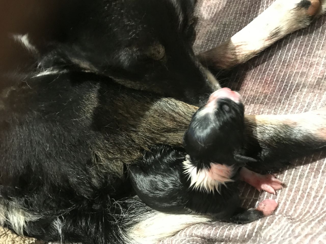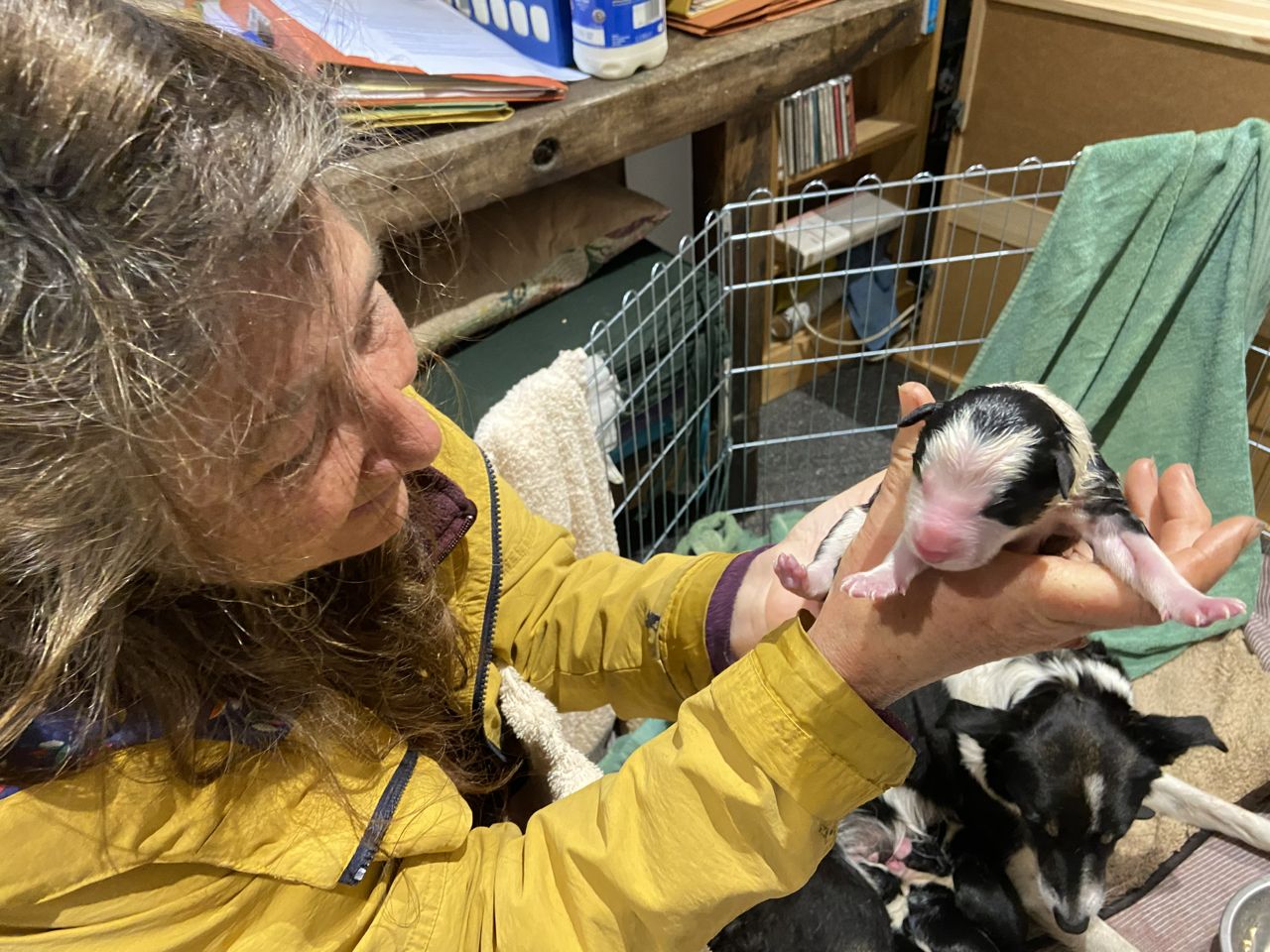 The birth on Monday 23 May, of both Comet and Buster. One of me holding Buster. They are like guinea-pigs. Lucy was there with me for the birthing (thank goodness), that once started, was straightforward. Bobji became a natural mother, eating all the after birth and nurturing her pups with care and assiduous cleaning.