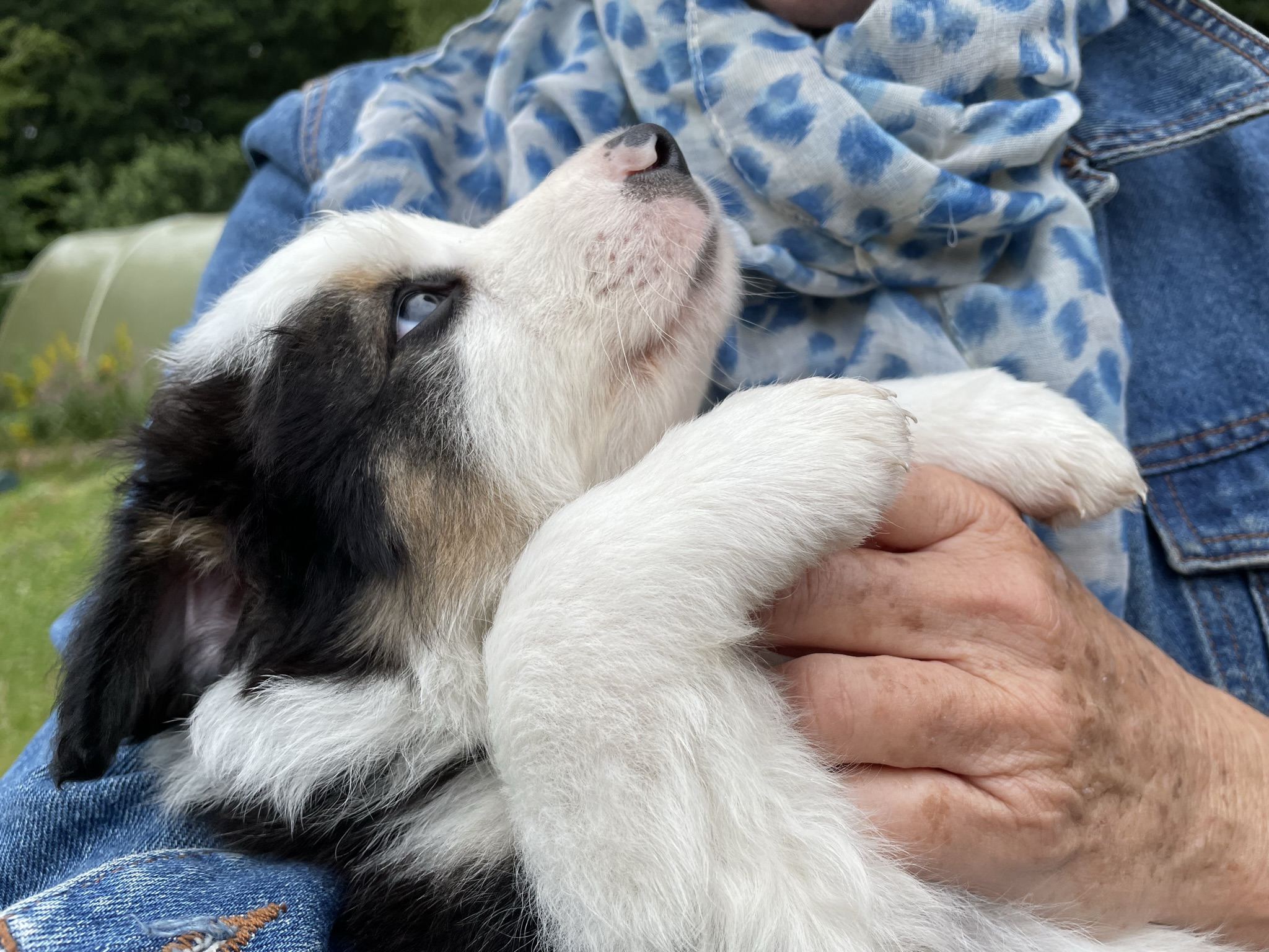 Bobji, my bitch, gave birth to 4 pups on Monday 23rd May. They are now coming up to 8 weeks old. Two have settled homes. One, known as Eyebrows, I will keep along with Kali and Bobji. One, known as Jet, will go to Lucy to become a working sheep dog, along with her father Jake – the father of all the pups – a long haired tri colour beautiful border collie.