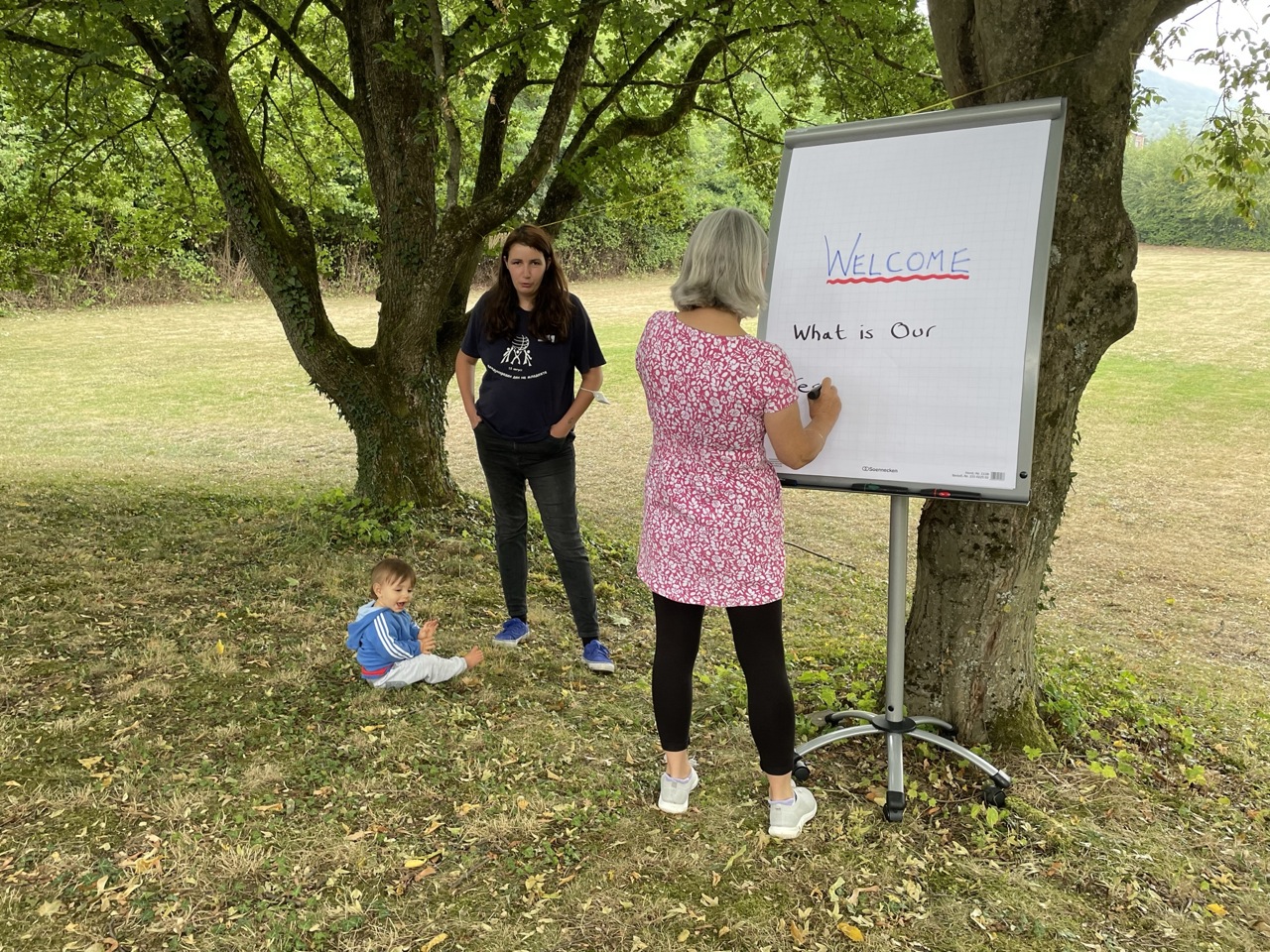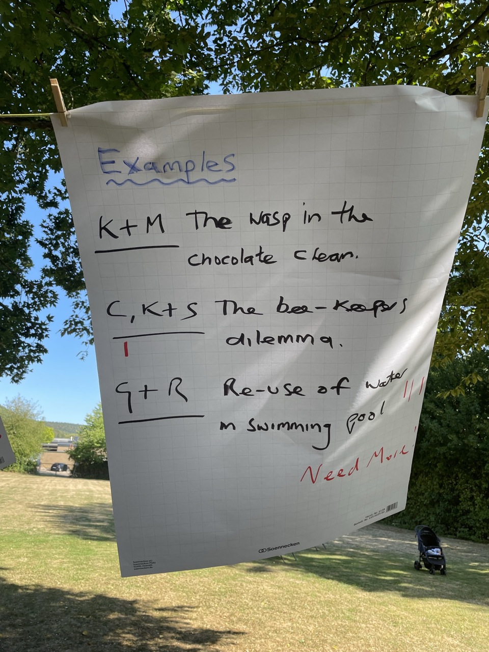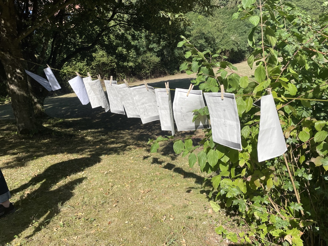 We chose a perfect space: close enough to the centre for ease of access and with a canopy of trees to protect us from August sun and later rain, as well as act as a good prop for our washing line – essential for hanging our dialogue conversation on. Near by we found a room from which ‘borrow’ chairs and a writing board from, although most people chose to settle on the ground.