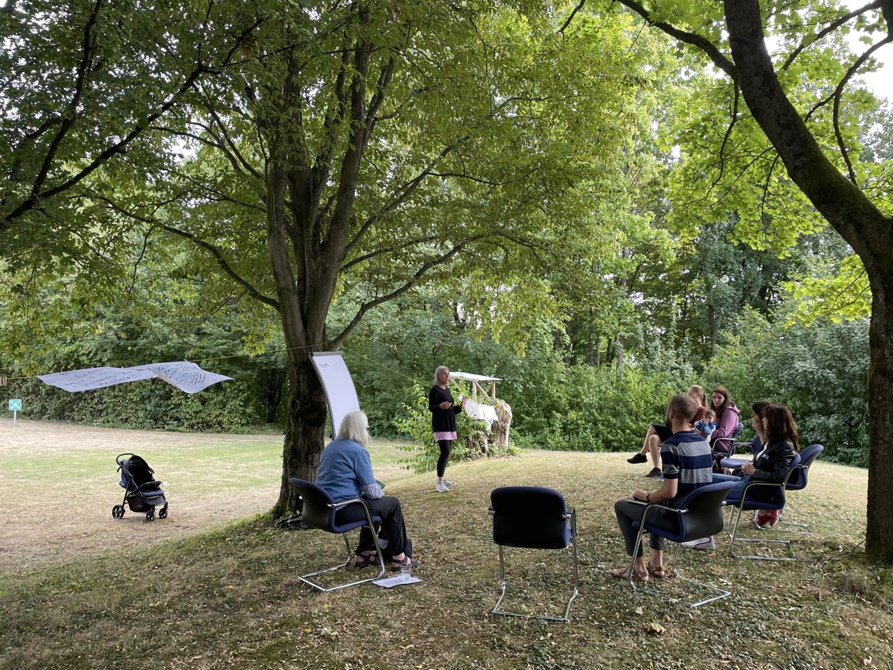 Dialogue in a woodland setting discussing the question: What is our responsibility for Nature led by Dr Julie-Marie ffrench Devitt and Rachel Kellett with support from Prof. Dr Sarah Banks.