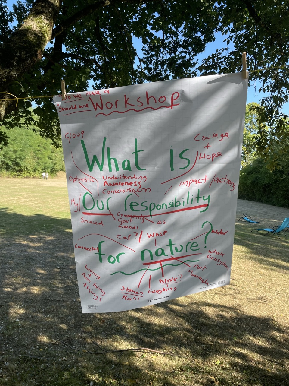 We were invited to work in pairs or threes, to find an example of our responsibility for nature in our lives. Of the pair, one was chosen as the most suitable example, and one was shared with the group. The group finally selected which was the best of the lot