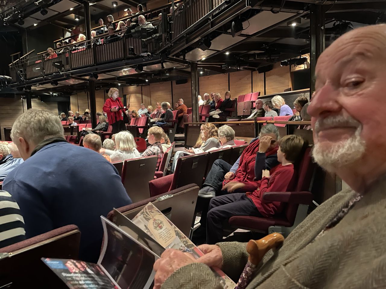 We were here to see David Edgar’s adaptation of Christmas Carol, had perfect seats in the stalls, for both of us the first time seeing the stage as an apron. Fabulous theatre, based on Shakespearn model, intimate, cossy, three tiers, the top with high rake.