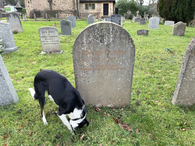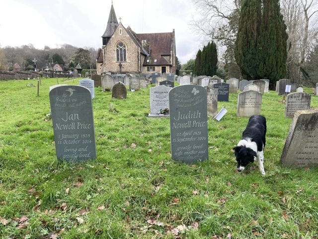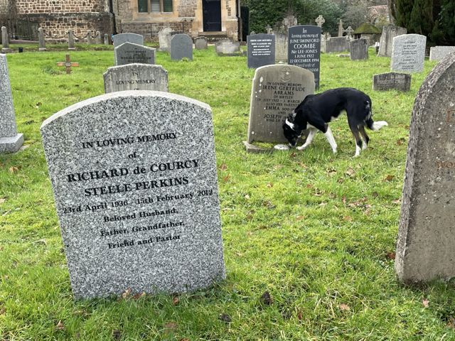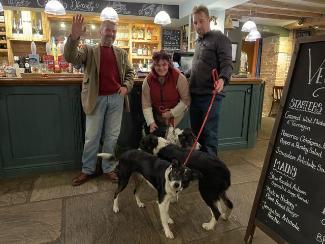Out we went for our last evening. First to eat at Liphooks Pizza restaurant which was once the home to Charlie’s picture of 13 Yaks, then a dog walk to the Links, which was Peters watering hole. Three border collies entering a sedate eatery, was an entrance. By remarkable chance the only two people at the bar were horse people, and had a scent the dogs were attracted to, as we were – with good fortune. Willy Fishpool and Veronia their names. She no longer rode (too many accidents) but did carriage driving, not like the Duke, but fast (it has a name i’ve forgotten). What’s your work, I asked Willy. ‘I’m an artit who works with burnt clay’, he said. A bricklayer! Born and bred in Liphook, I asked if they knew Peter. After a false start, they both did. The Pin Stripe or Suit, he was known as. They were at Peters funeral. Being on the other side, they went to the Bear afterwards.