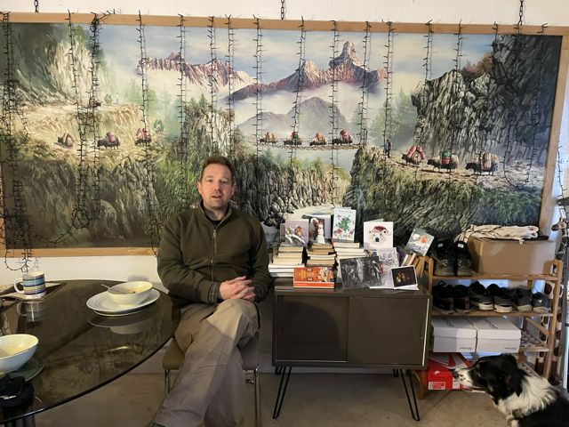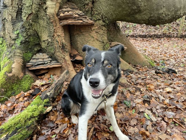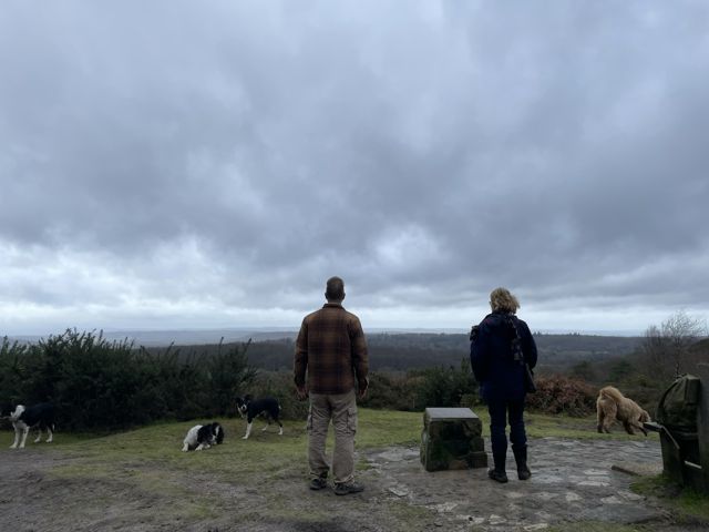 Here’s a photo of Charlie in Liphook, where we started from. He is in front of a painting he bought from a Nepali restaurant, now closed. ‘There are 13 Yaks in the picture’, he tells me. I was given nourishing soup, and the dogs a bank of pigs ears, and the first red lead – which I know will become a souvenir of Liphook.