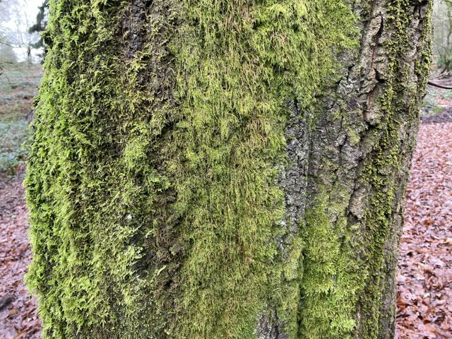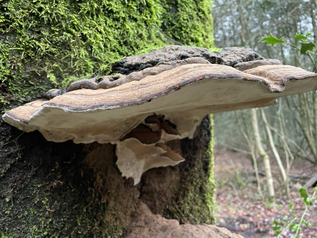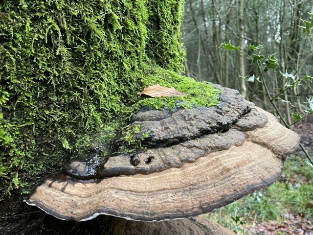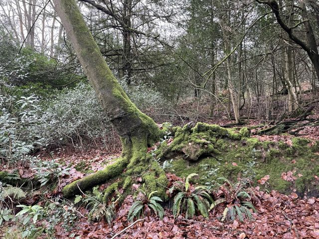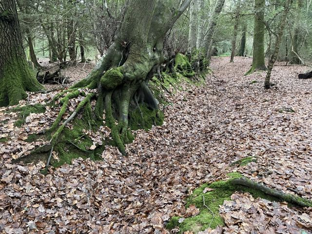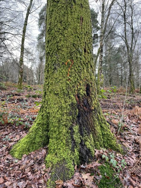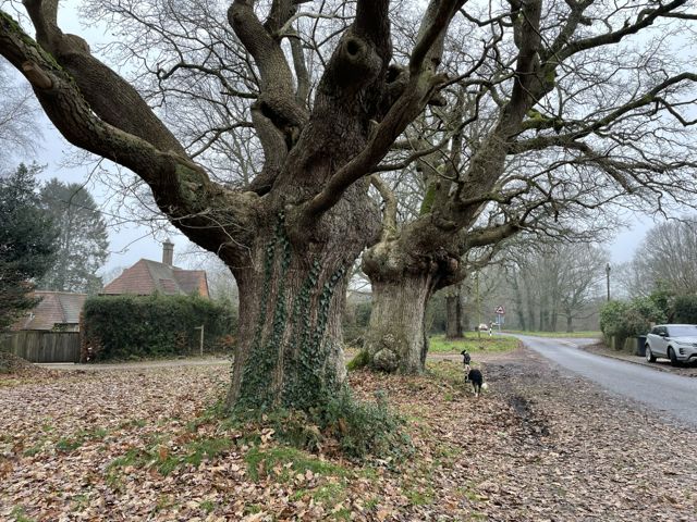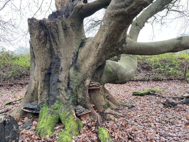 Checking out of our cosy cowshed, we returned to Liphook, and to find the walk to the hills that we saw from the Temple of the Winds, so join up the dots, which we did in so many ways. Charlie took me through the woods. Masses of moss, (feather and fern) comfortably clothing the lower trunks to the forest floor, and lots of hairy curtain crust and Dryads saddle fungi, breaking up the deadwood. He took me high, to the place of amazing coppice – which I realised was not ash but Sweet Chestnut, being made into pailings and fence posts, as we walked. It was an old coppice, and such pleasure to see it being rotated still. Indeed all around Liphook village were the fruits. We came out into Lynchmere church and village, and I heard from Charlie, that it was here that Tori and Jeremy found a home they fell in love with but bought a place off Portsmouth Avenue which they called Lynchmere, the place and name I knew, but not its origins until today. Fabulous old pollarded oaks, 6 of them, on the way outside of the village.
