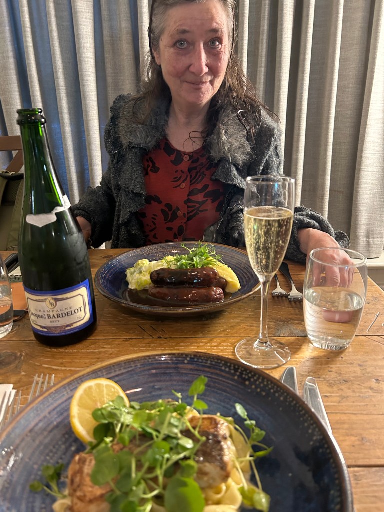 Champagne and mediocre food. sausages and garlic mash.