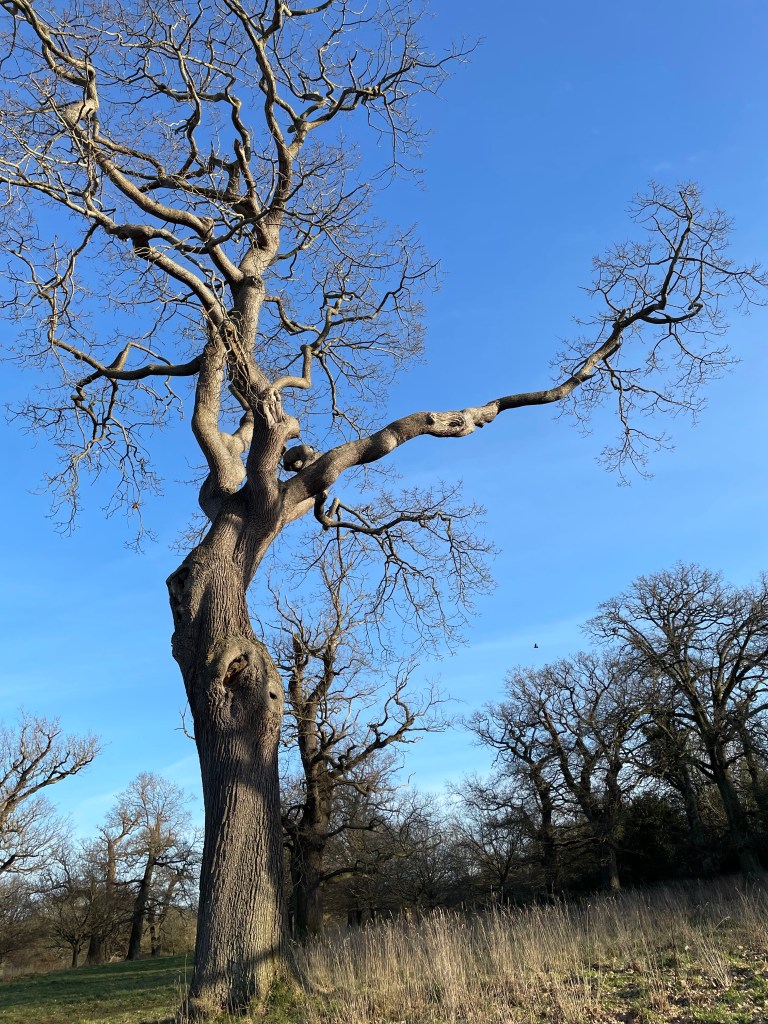 The pinnacle of Jacobean says pevsner: It is one of the major Jacobean houses in England, in scale and otherwise. While M explored the gardens, I found the back entrance to the park, perfect for off lead dogs, and a magnificent twisting sweet chestnut, a human plant form.