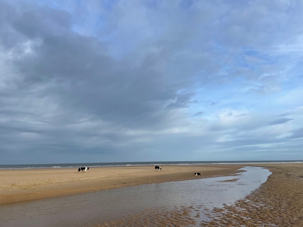 After the roller coasters, spirals, pleasure ground thrills, the walk was easier, the light stunning, as the sea and sky merged in milky off white grey. Dogs enjoying the new ball throw. Oyster catchers on zig zag sea groynes. A cuppa and pee break at the ski cafe, Hunstanton. Michael meanwhile had driven to tescos to find a charge, and some lunch.