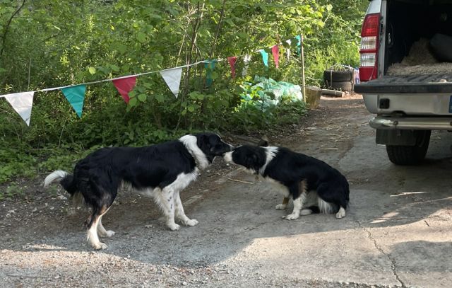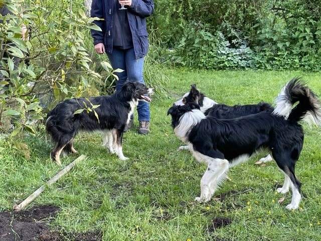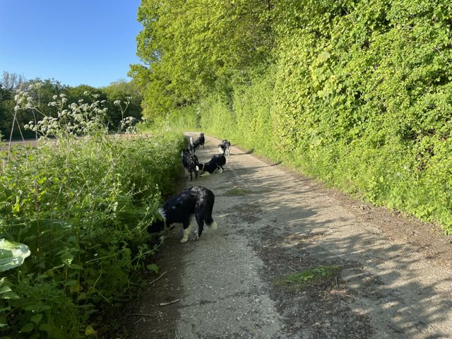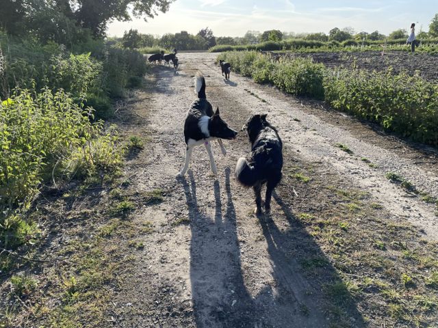 I wanted to show Lucy and Julian the land, but of course, Lucy only had eyes for the dogs, their first meet after a year. She bought Jet (of course), the father, Jake, and their step sister/daughter, Jazz. After a somewhat nervous dismount from Lucy’s car, Jake first, Jet last, they scuppered through the wood, finding each other and their scents, establishing their hierarchy. It was difficult to keep track of individuals as they became a pack. No Kali or Mossip, who were back at the ranch.