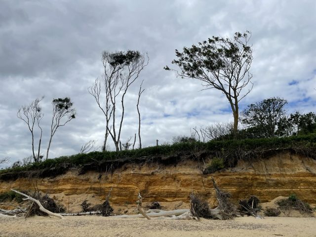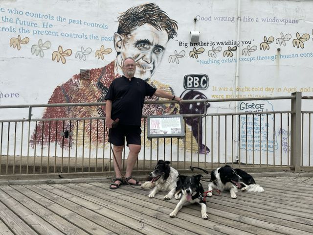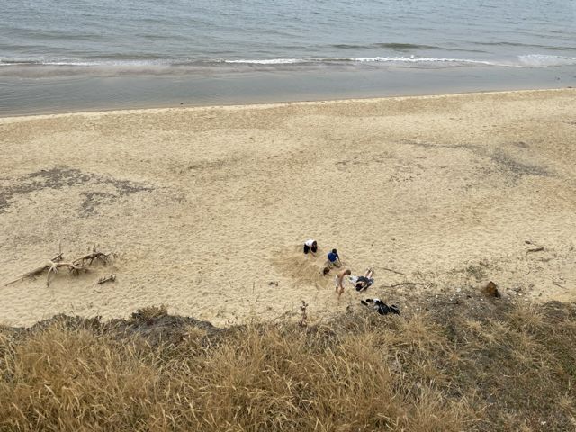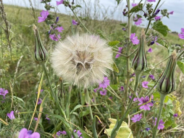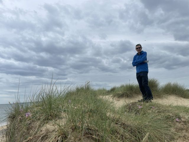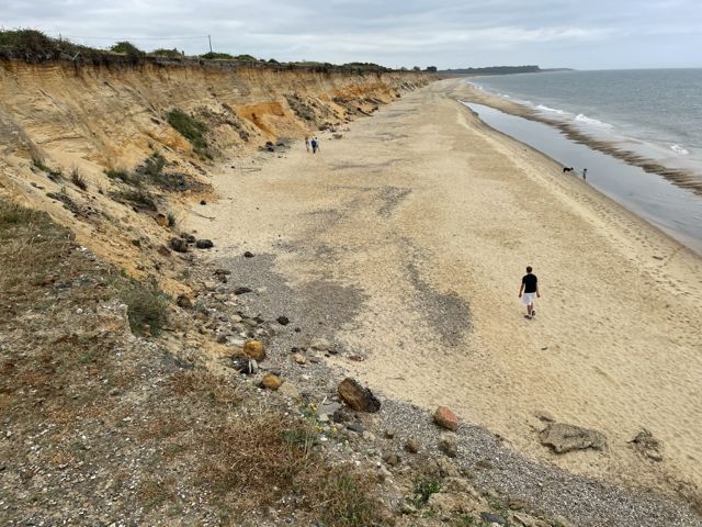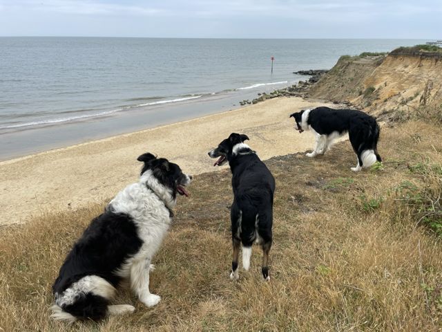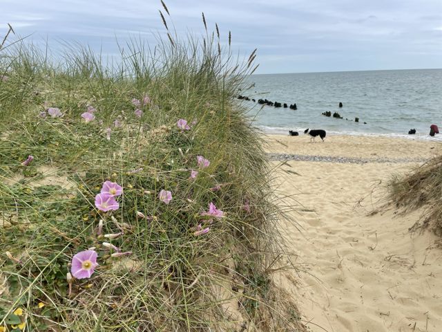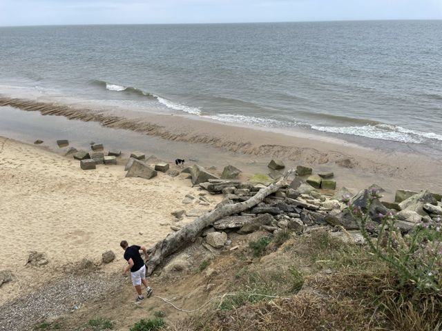 Finally on the last day, attentive to blisters, we meandered Dunwich museum, once again inhabited with an informative volunteer, this one an archeologist by training, with geologist parents, who gave us some low down on the absurdity of Sizewell expansion. Currently built on a slither of granite, with London clay underneath, the new one less firm of foundation, and even so the coast is eroding, it will be an island before long. How is it so obvious to us? As I made an unplanned swim in the north sea retrieving the dogs ball, a passer by called out ‘You should teach your dog to swim!’. Not realising that the dog, beloved Kali, longed to swim but could not see the ball, being mostly blind.