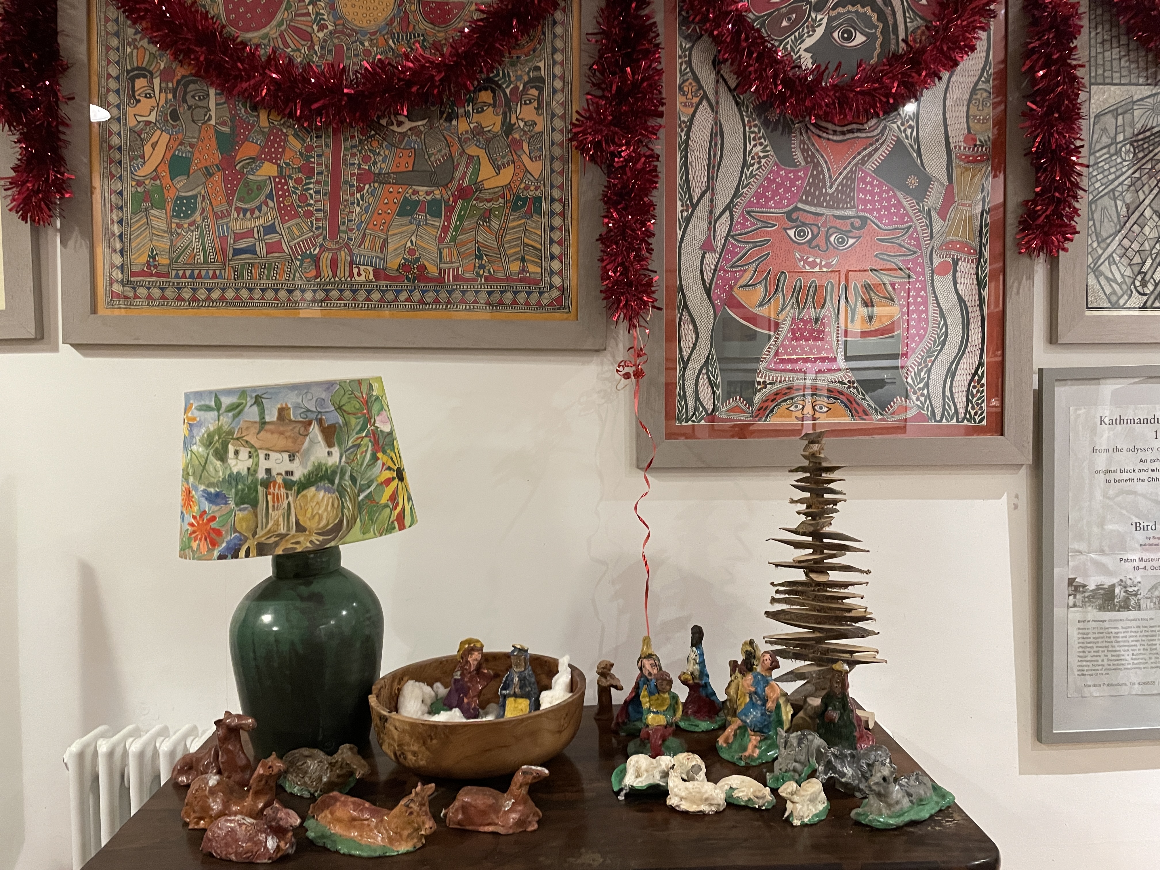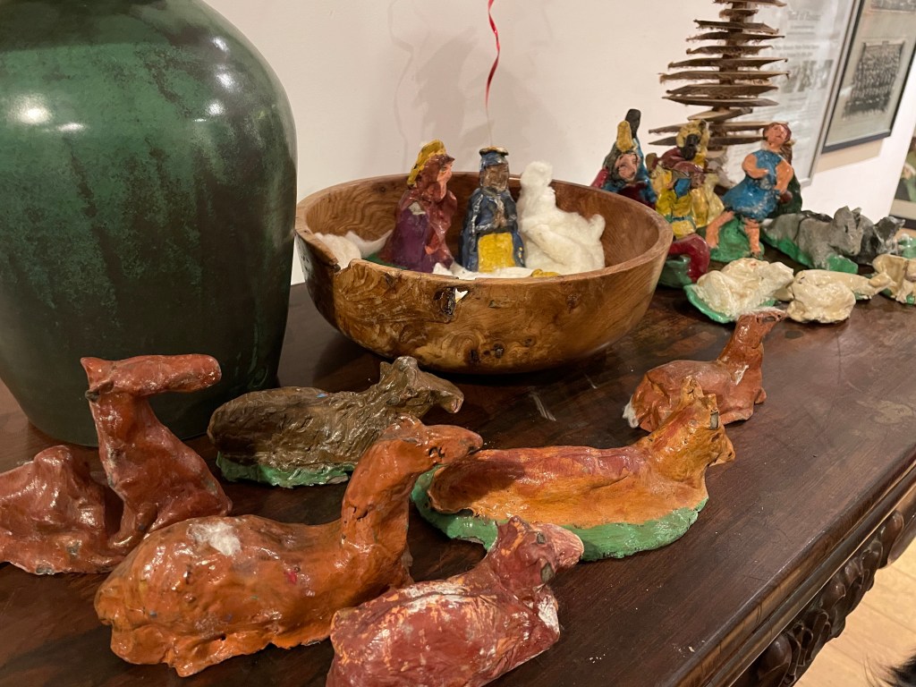 Among the contents, was a Smiths Crisp cardboard box (1980?) of carefully wrapped crib figures. They’d been made by my mothers class from Swanton Morely school. Mary, Joseph and the infant Jesus of course, some young shepherds with their 6 sheep, three wise men, with suitably dark faces, some camels and donkey’s. All made by children’s hands in rough clay, coloured and fired. Those hands must be in their 40’s if not 50’s now, and have no idea their creations decorate my table at christmas.