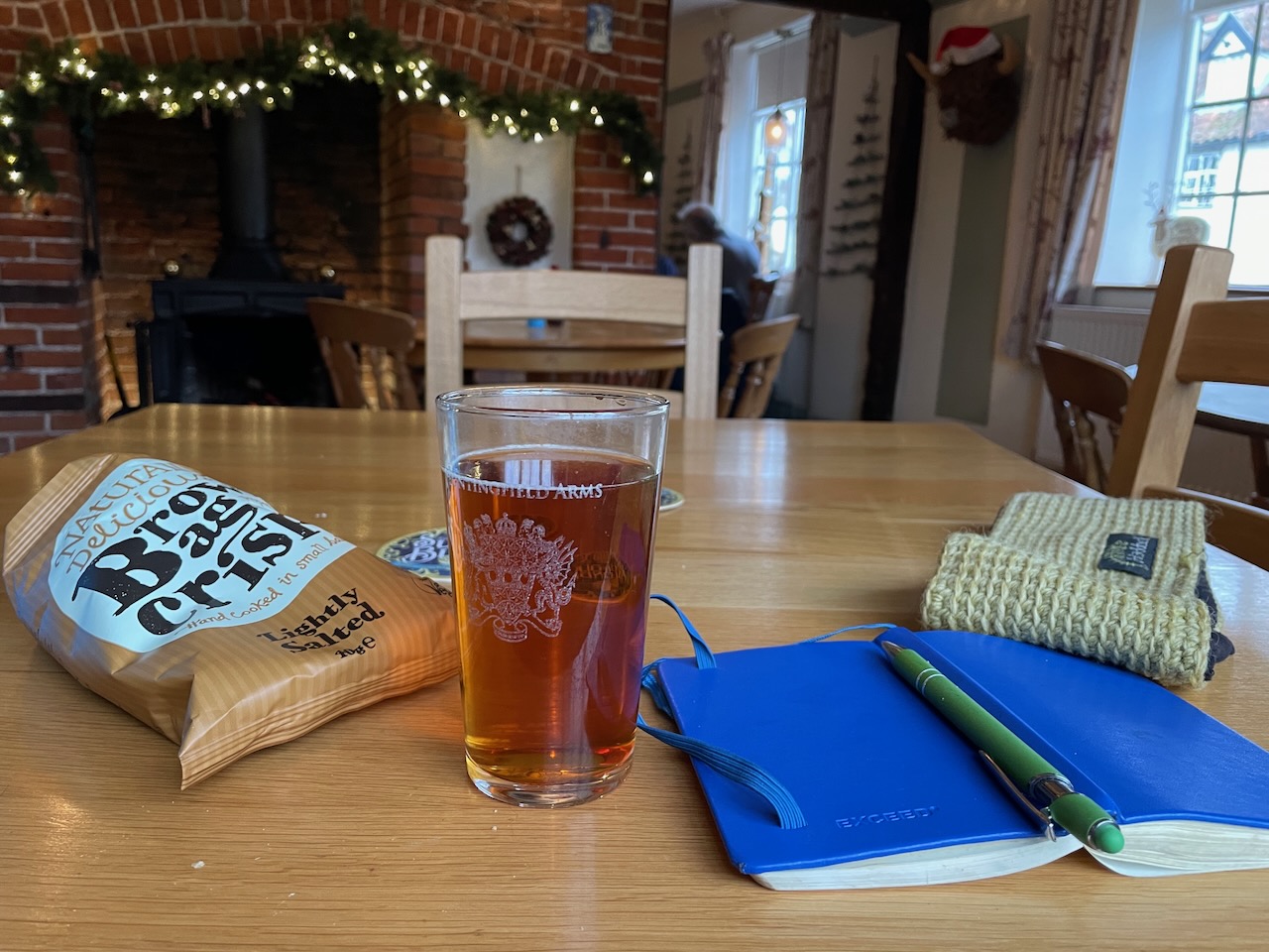 Ended in the Huntingfield Arms, too late for lunch, and with dangling glasses, broken when lifting Kali over a stile.