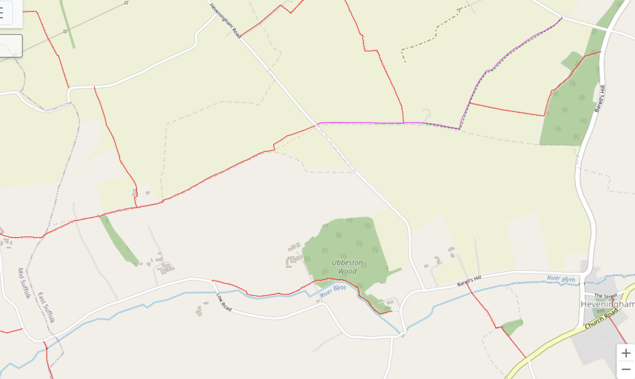 Set off from Heaveningham, parking at the start of Barrels hill (which was not a hill). Dallied by the church, now a private dwelling, as a polite sign describes, since 1981, with graves neatly lined along a well kept path leading to the remaining grave yard, neatly done. Must be a magic home inside. Failed to find the path through to Ubbeston Wood, but following the Low Road, walked up track (ignoring the sign saying Private, by permission only) I found where it would have come out, as I continued along to the west, walking right beside the Blyth. Came back out on the Low Road, blissfully quiet (was it a Quiet Road?) .