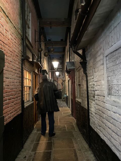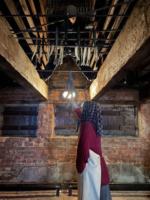 At Time and Tide (dogs outside) we could smell the herring in this old herring smokery, and marvelled at the industry of stacking the herring all the way to the high ceilings. Glimpsed one of the medieval town wall turrets near by.
