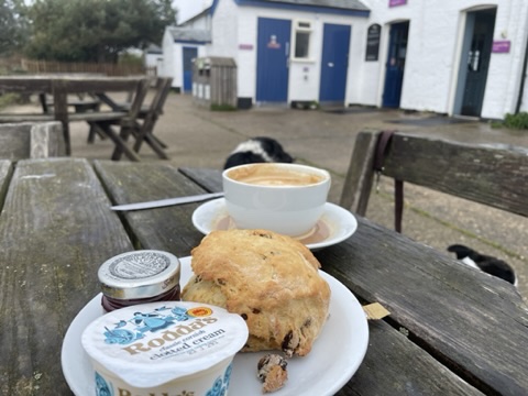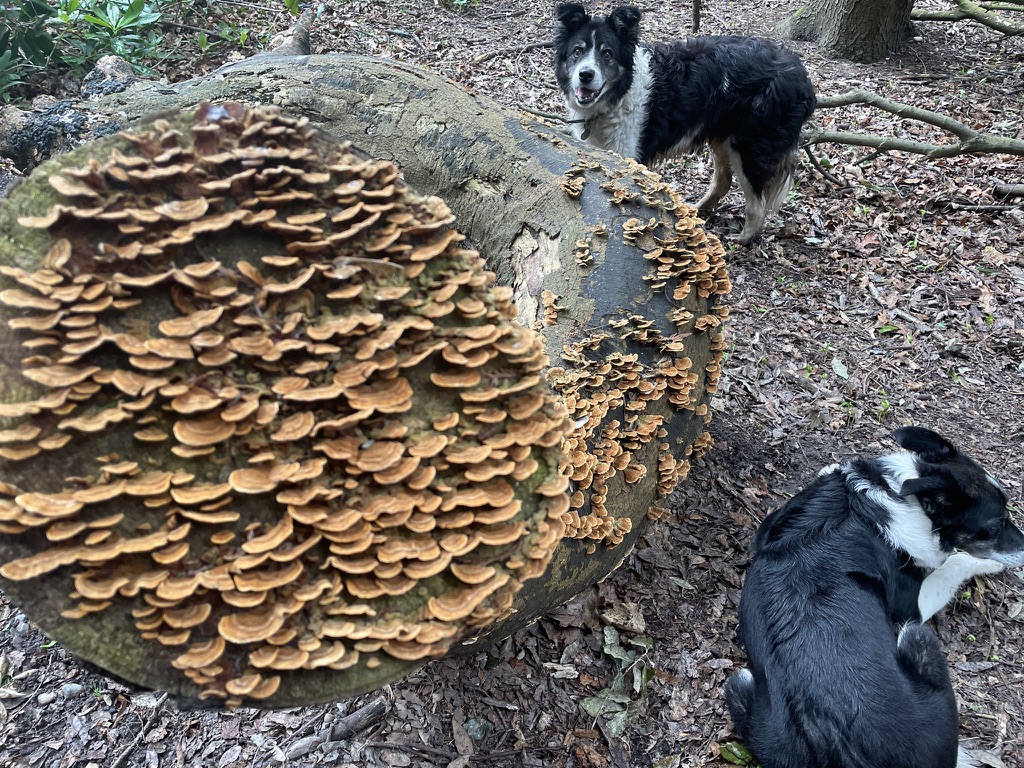 After a week in the wood and on the land, dogs needed a stretch. As we rocked up at Dunwich car park, passenger window open, Brows jumped out and made a dash for the sea, he could not contain himself. A group of walkers were open mouthed. So naturally we started along the beach, Sizewell in the distance, tide out so easy walking on firm sand. Cut back in and backtracked to the Coastguard cottages, to find a delicious scone cream jam and flat white, in light rain. Dogs on leads over the health, then back through Dunwich grey friars woods, finding myself delighted I do not live in one of these rambling beautiful houses – far too much up keep. Amazing turkey tail and verdant green fungi.