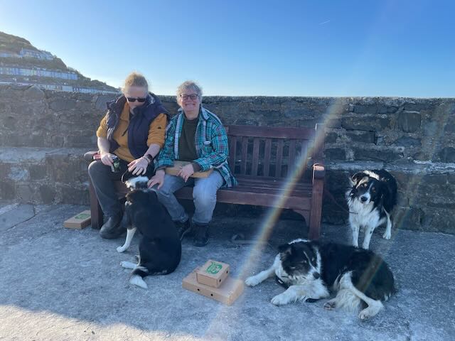 “What fabulous dogs you have”, she said ‘This one reminds us of the one we had, so similar, also a short haired collie’. Her friend was metal detecting, and Bobji was helping her dig a hole in the sand – a favorite pursuit. I only left their easy conversation as I felt pressed to find a place to stay the night. But the sun was still warm and inviting, and so we accepted the invitation, and got fish and chips from one of the 3-4 places to get such a dish. While collecting, the two girls arrived considering the same a good idea. Welcome to join I offered, I’ll sit on the harbour. They were a joy to meet, and quickly we found our 5 degrees, and so many more avenues to explore: They had met over 20 years ago at a death convention, Cath (Brew) was a graveyard gardener (did I remember correctly?), and Angie (McLachlan) a practicing embalmer. While witnessing a man trying to get the attention of the audience with a spoon on a plate, Cath did a magnificent wolf whistle, that’s my girl thought Angie. I never explored or gathered her work with the dummies, nor did we explore her link with Phillip Carr Gomm (she was a member of the Order of Ovates). With Cath we shared a love of being on the road, as she had been raised with parents who believed in road life, and took her off to India in her teens.