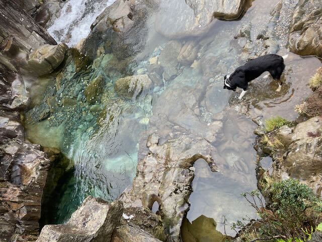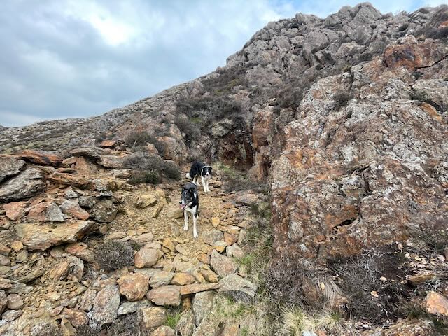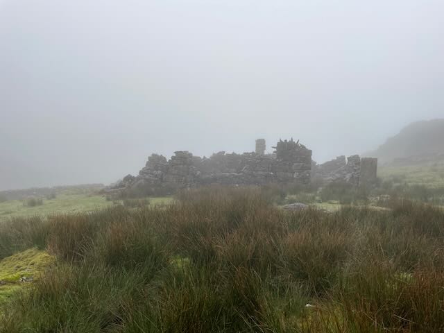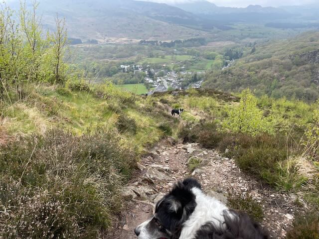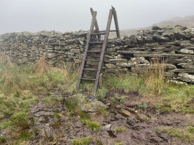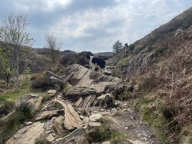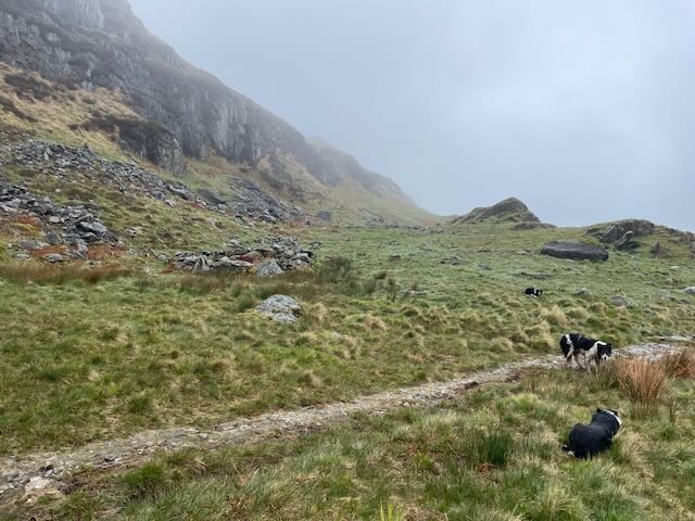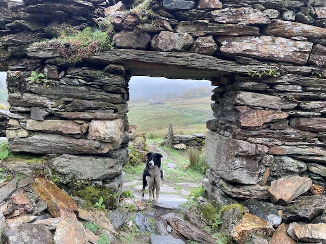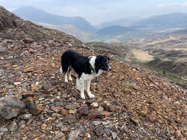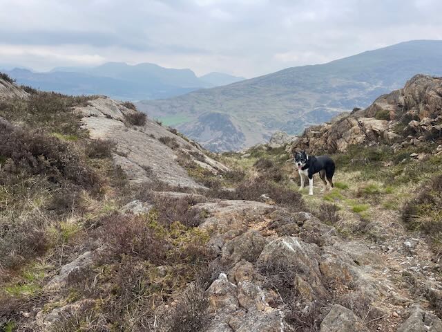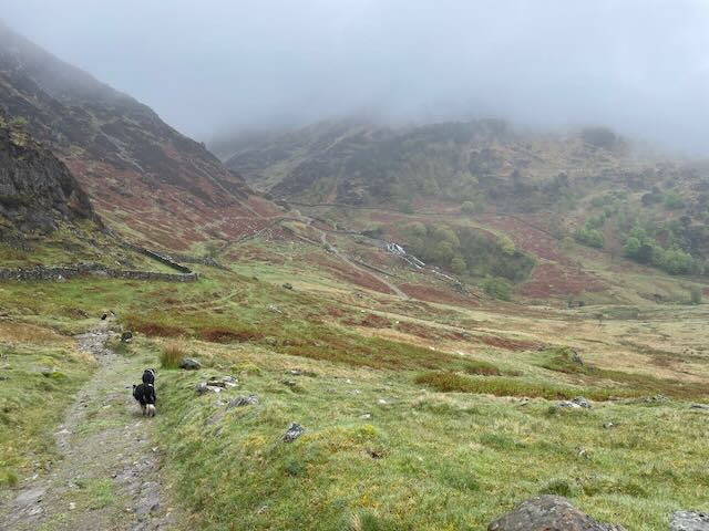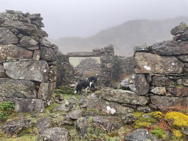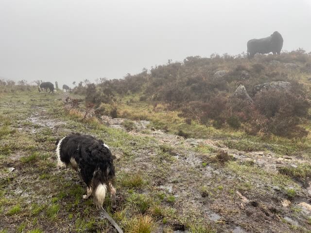 A few challenges. The stiles over dry stone walls were increasingly tall, and I had to lift Kali over them. The first one I said, I’m not stopping now, Kali. The last took several attempts. We occasionally found sheep around the corner, but Brow was good, with STOP DOWN command. A cow appeared over the brow of a hill. We lost our way at the top, the useful black signs missing, mist descending, no GPS but after some false starts found some tracks which worked. Passed old copper workings and habitations