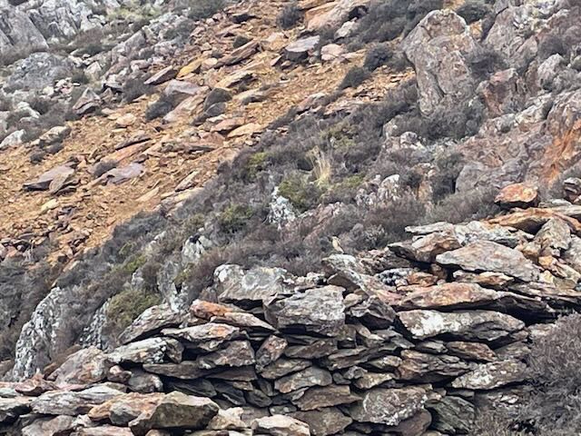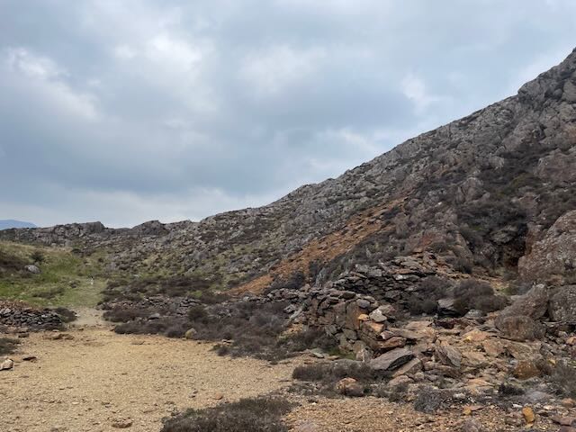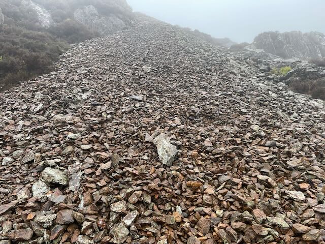 We come to remains of working of a copper mine, red rock, and once again I wish I knew more of geology. A very inelegant descent, through a field of cows, and sometimes on a bottom. Gosh gone gone the mountain goat. Must cut little toe nail!