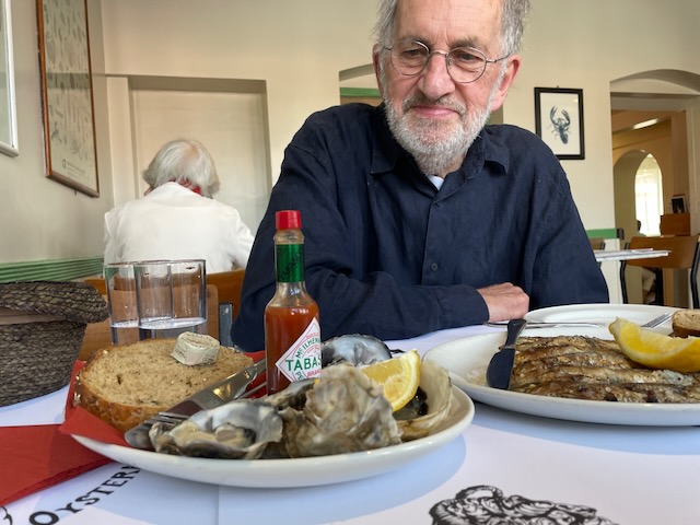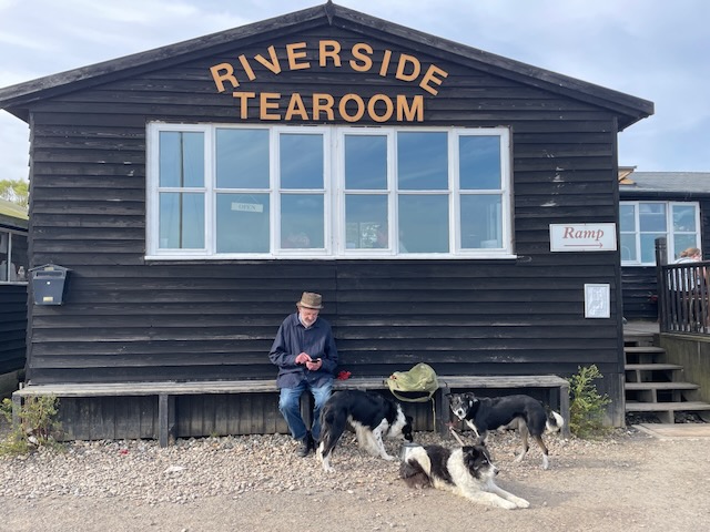 We motored on to Orford for the point of this adventure: to celebrate B’s swallow. Taste may not be relevant, but the oyster with a dab of Tabasco was welcome. Along with some sardines and brown bread, Pinney’s was unchanged. We walked the dogs along the sea wall to enjoy an ice-cream and tea in the sun, watching those that dabble in boats come and go. We hoped to return one day to take boat to the island.