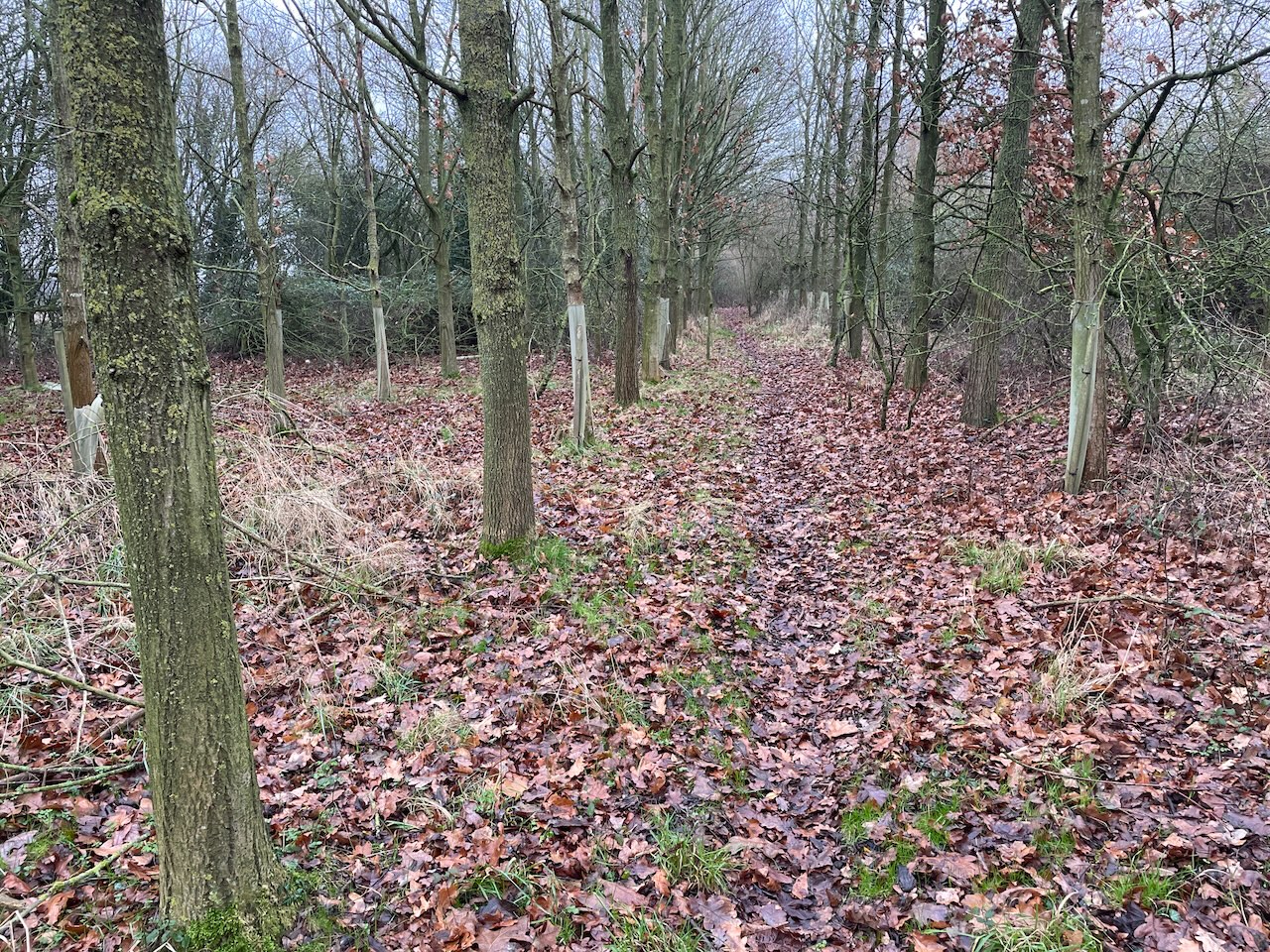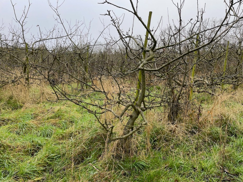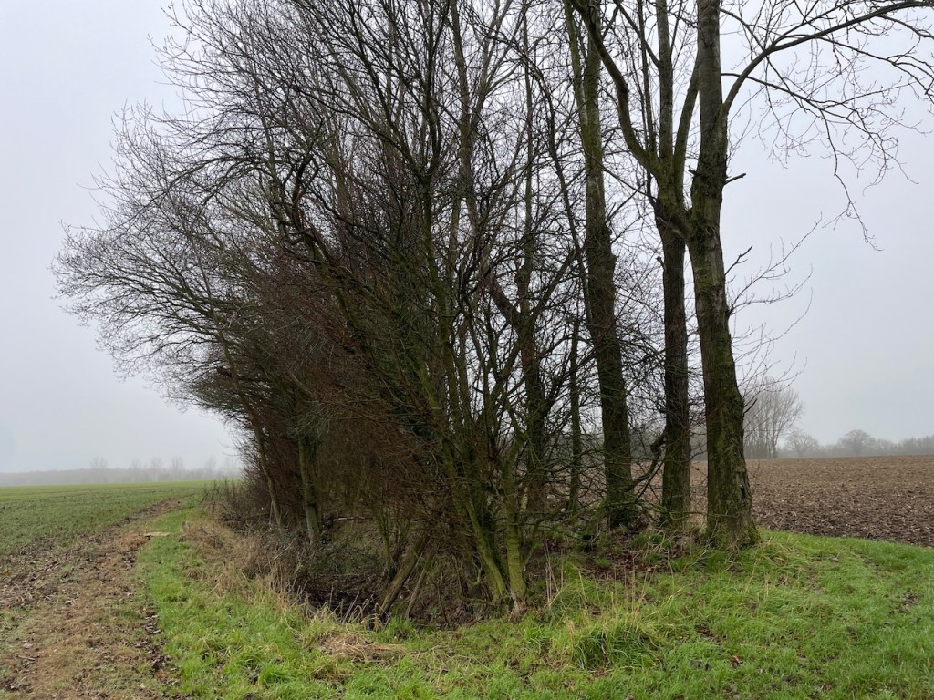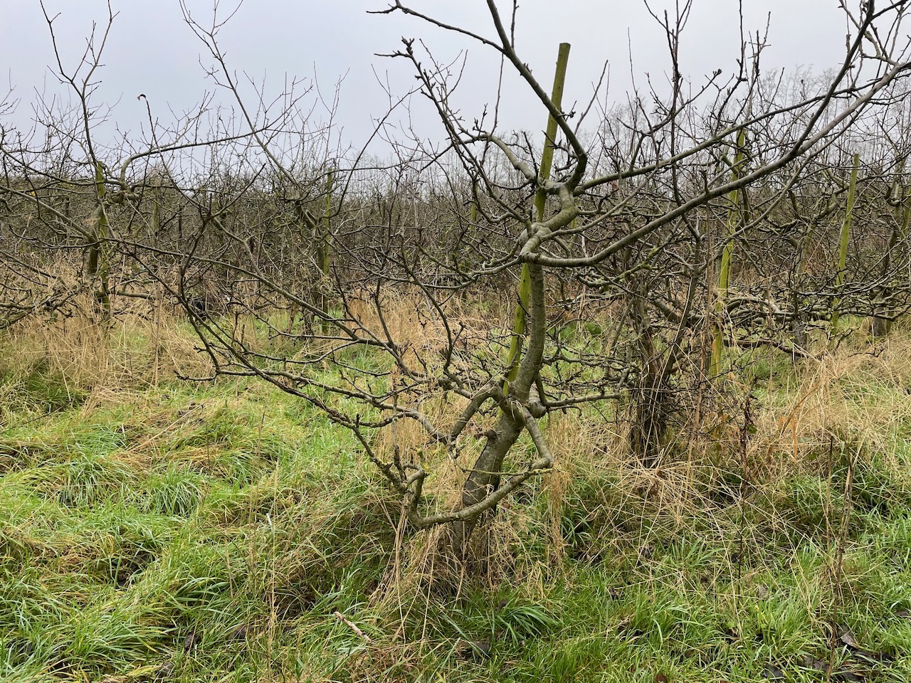 Parked easily on another quiet road. Over a field well ploughed (no footpath), the on our right the Auld stream clear and clean. Through a tree plantation of mainly ash, also hornbeam, their plastic cases bursting out – perhaps 20 years old I guess. Along a resevoir, and into an old apple orchard, their naked branches reminding me of Mondrians abstraction of an apple tree, and to get on and start drawing again, and not take another photograph. Perhaps I will start carrying a sketch book and ban the camera, but the camera is the phone, which has the route which got me here. The way ahead, the source of the Auld, is blocked deliberately with briar and sticks. I think about trespass, but turn obediently, as I knew there was a second source, not so far away.