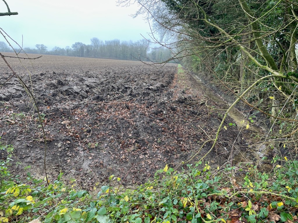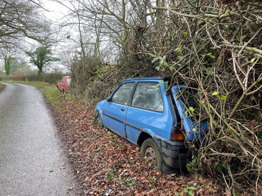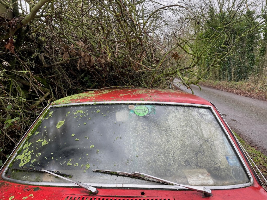 Over a field, beside a dark conifer woodland, another well ploughed field, right to the edge, ditches recently ‘cleaned’ – these farms are old fashioned, clean, clear – along the Thoroughfare, where we come upon two motor cars embedded in the hedge. Fascinating naturally. Turned down a farm yard track, a bit nervous, but got to the source: two handsome ponds.