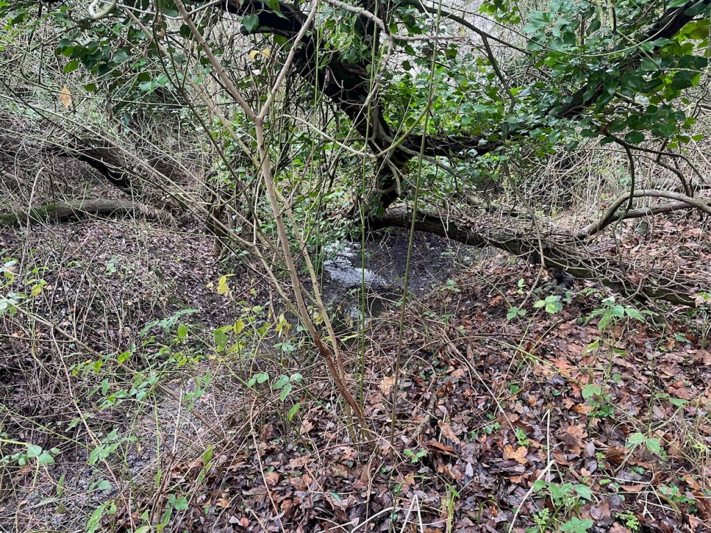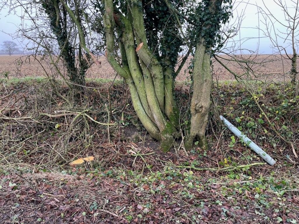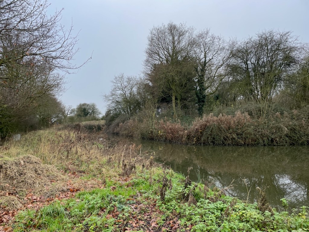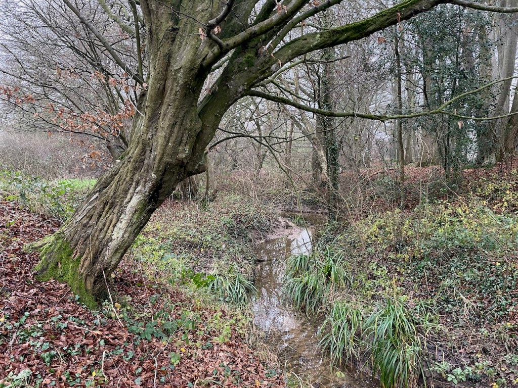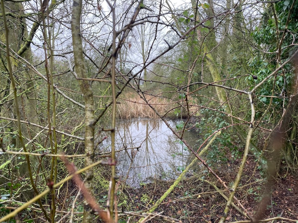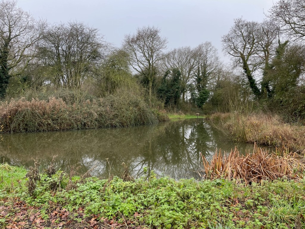Walking the River Blyth last year, I did not do the last part, the walk from Ubbeston to the source of the Blyth, which I understood was somewhere near Laxfield. After some prep homework with maps the previous night, I drove the road way all along the Blyth, last years route, reaching Laxfield and Dennington Road. Not always easy to find a parking, I parked half way, half off the road, and walked up beside the stream the other side of a cut hedge. It was indeed a Quiet Road, nothing passed us, the peoples of this hamlet had parked up their Tesla’s, and were behind their windows, carving turkeys, pulling crackers, opening presents. I was glad to be out of it, looking in. Coming up to the triangle, where a nice plain plank of wood provided a practical seat, I saw around the corner, behind the hedge, a pond. Ah I thought, in here the Blyth must rise. Unfortunately the continuation of the Blyth on the other road side was PRIVATE, so I did not join up to Ubbeston.